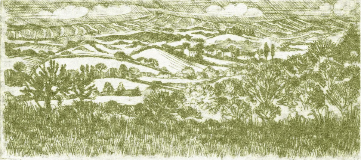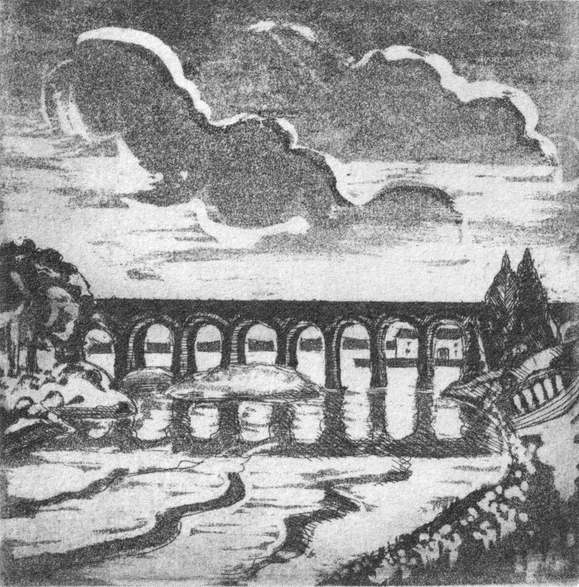 . . . As it is one of the most pleasing architectural features of the local landscape, I drew the Twelve Arch Bridge on many occasions and it reappears in a variety of forms amongst these etchings. One village magnate commissioned me to do a large picture of this monument for his new house. The price was agreed and the picture eventually produced. I had chosen an angle which showed the bridge emerging as it does from thickets of brambles and conifers on either side of the water. Delicate fronds of foliage wound in the foreground of the picture and the subject itself basked in the distance, looking solid and ancient. I was quite pleased with the results. When I presented it to my patron he gazed at it in silence for a long time. Then with a large and calloused hand he ran his index finger across the view a number of times, shaking his head slowly as he did so. ‘No. no good at all, It won’t do,’ he muttered more to himself than me. He had been counting the arches. In my enthusiasm for the atmosphere of the piece the accurately rendered number of the arches had become obscured, those on the extreme edges becoming partially lost in the undergrowth. The commission was rejected. If you are paying for twelve arches you don’t want to be short-changed with ten and two halves!