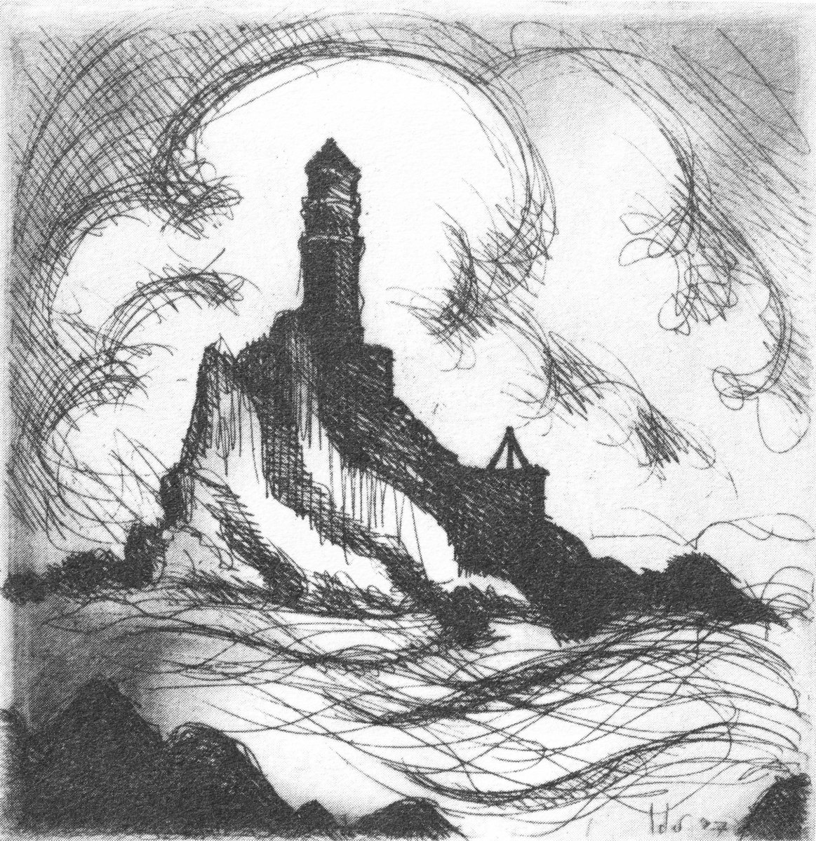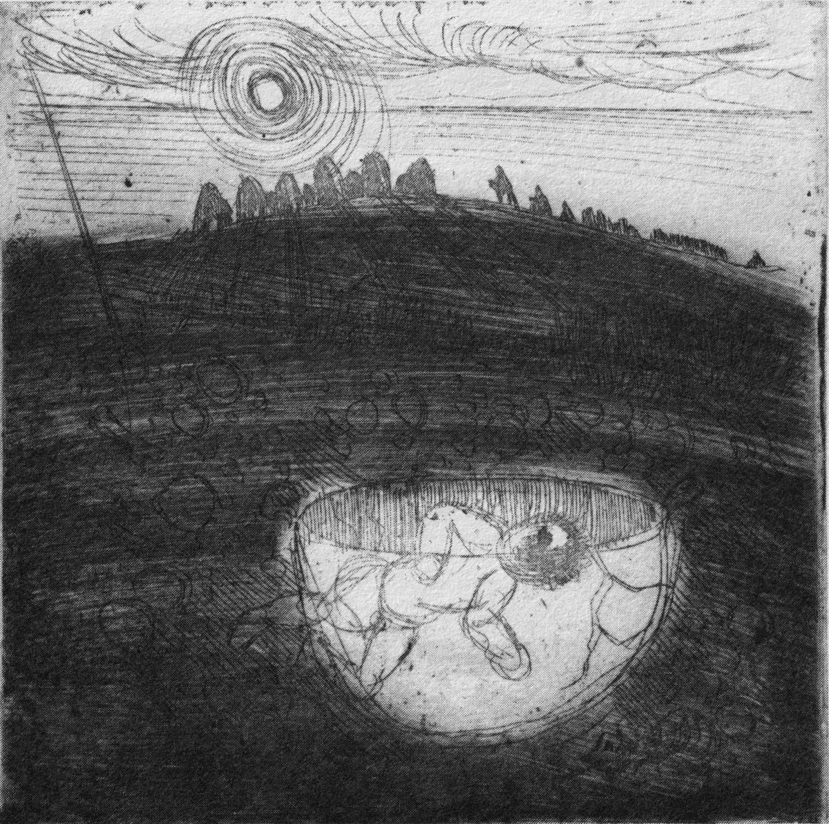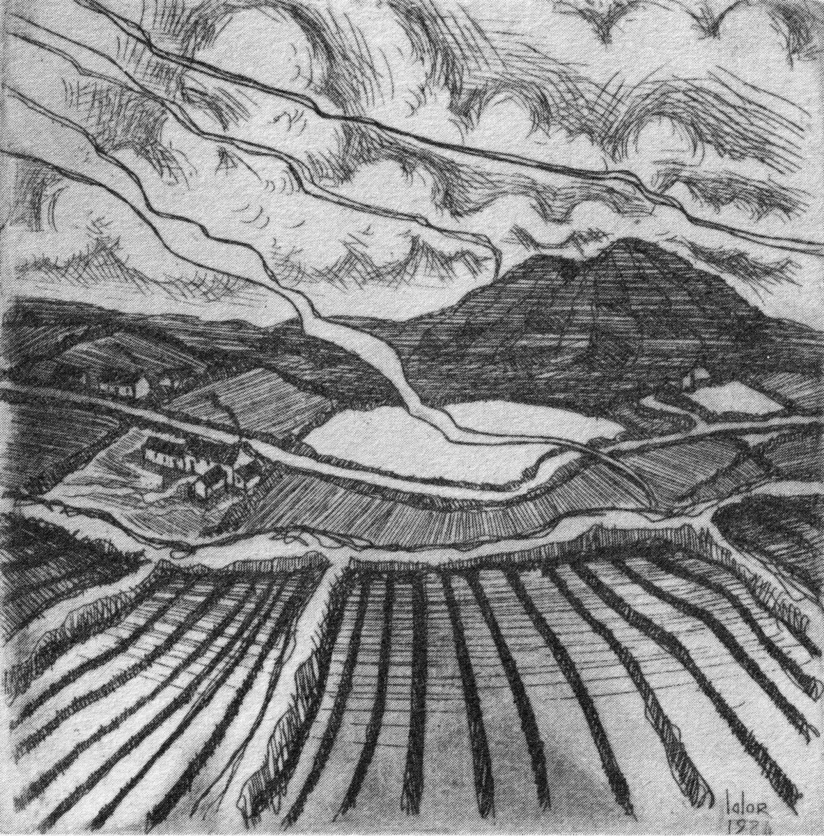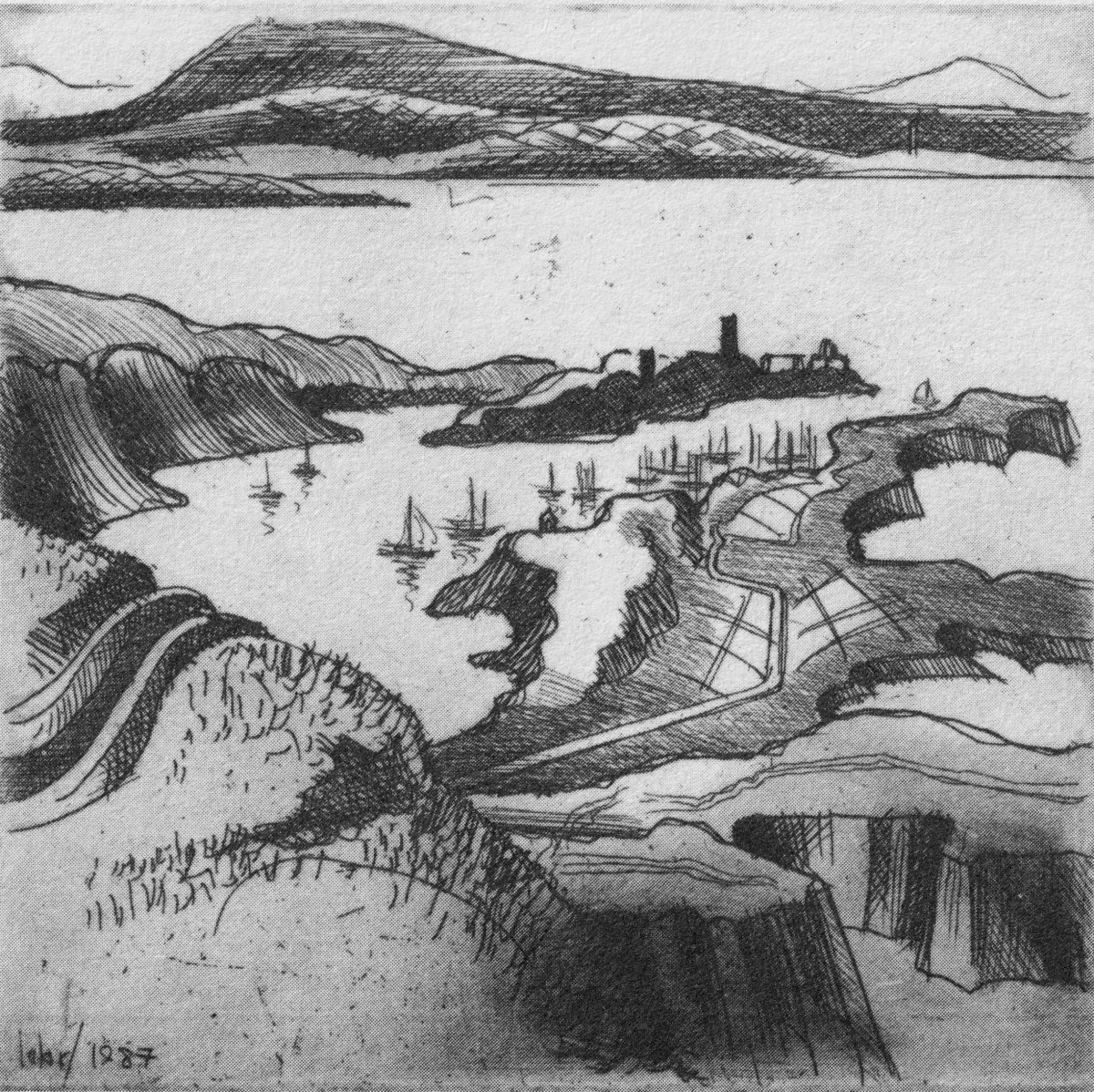 . . . The Landscape of the mind, which co-exists, interlocks and overlaps with the geographer’s vision, is an intangible, ephemeral thing. You may encounter it unexpectedly on a moonlit night or on some deserted headland, or perhaps in the dim light of a public bar. In this part of the world, soaked in memories and half-memories of the past, much is implied rather than stated. Like the collective unconscious, the landscape, too, is composed of a multitude of intertwining details. This collection of etchings of West Cork is concerned with those details: with small corners of towns and villages, with oddly-shaped fields and erratic skylines. Each etching is a vignette of landscape, architecture or environment. The pictures are organized around a number of themes yet the material as a whole has such an overall unity that what illustrates one section also has relevance for another. The point which they make is a collective one . . .