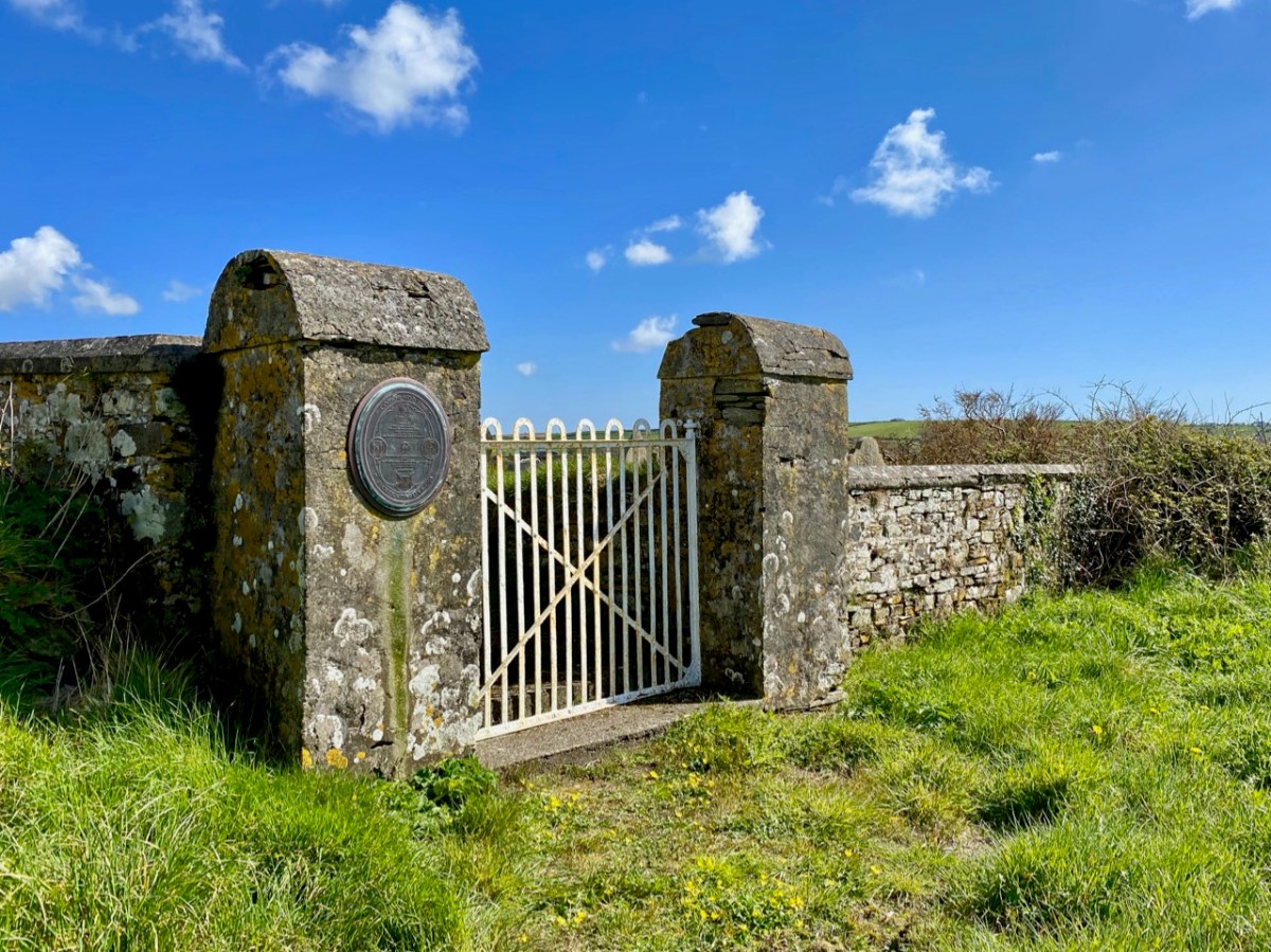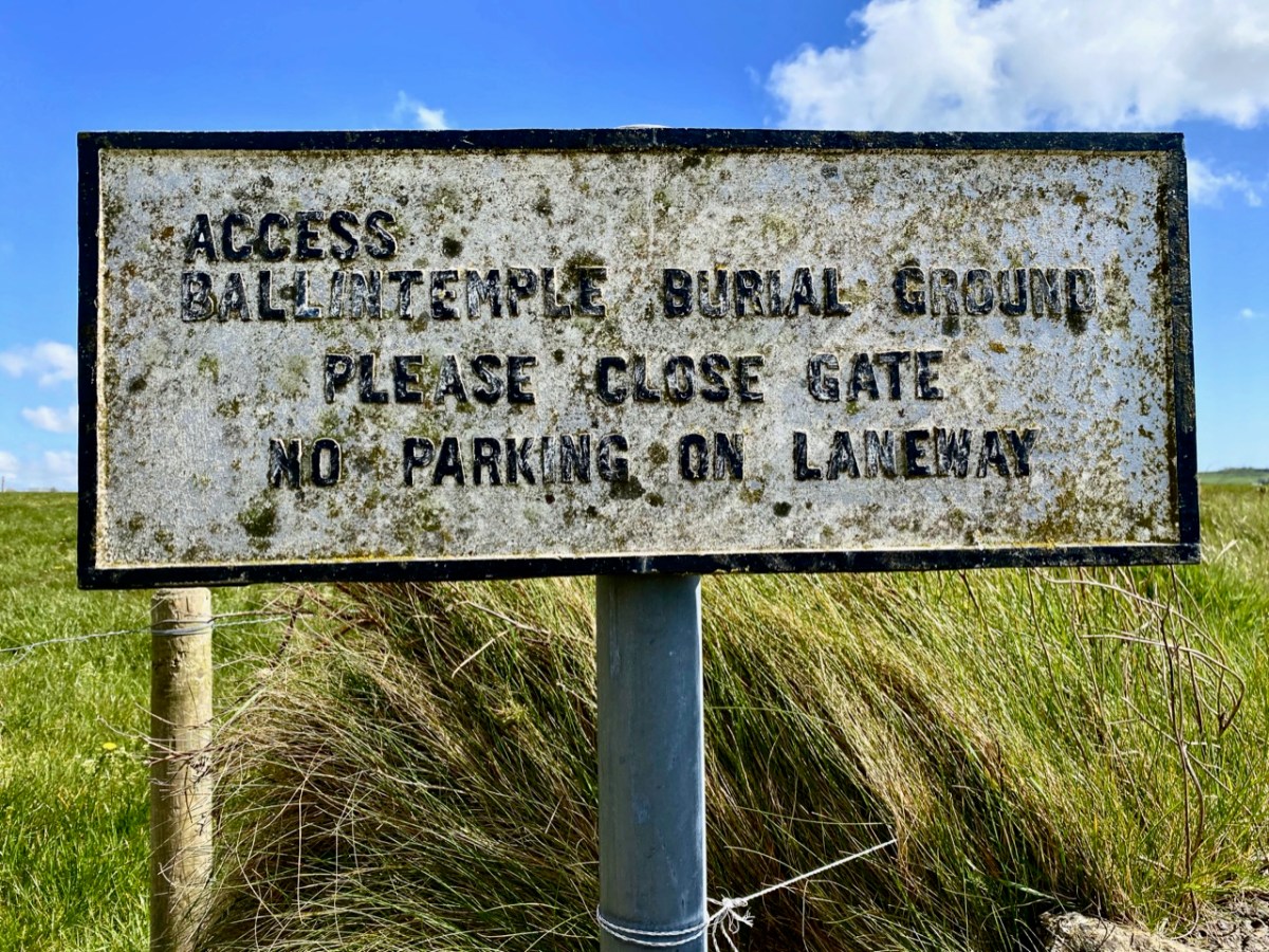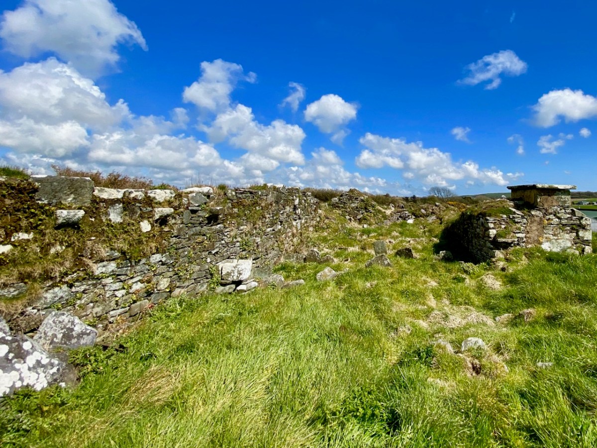 This bust of Michael Collins is sited at his home place, Woodfield, Sam’s Cross in West Cork. There’s nothing left of the main house now (below): it was burned down during the Irish Civil War. But the original cottage still stands as a shell (it’s behind the trees in the background of the lower photo, to the right of the Public Works signpost). It was there that Collins was born.