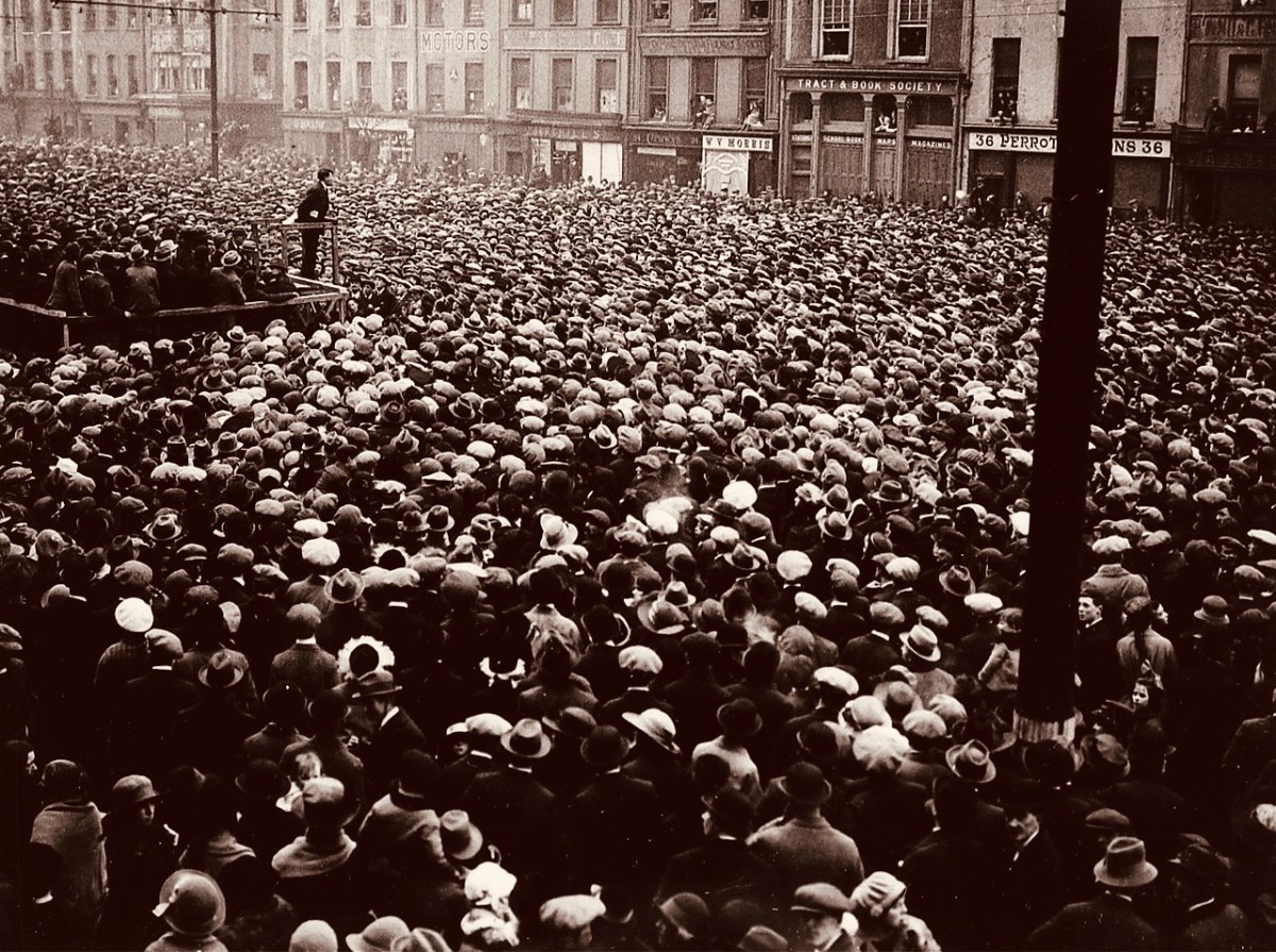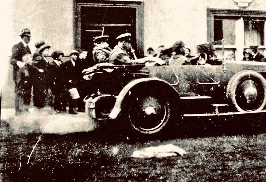 (Above) – a reminder of the ‘glory days’ – Michael Collins addressing huge crowds at a Free State demonstration in Cork City, 13 March 1922 (Wikimedia Commons). (Below) – Collins (behind the driver) leaving the Eldon Hotel, Skibbereen, 22 August 1922: the last known photograph of the hero (Cork Public Museum).