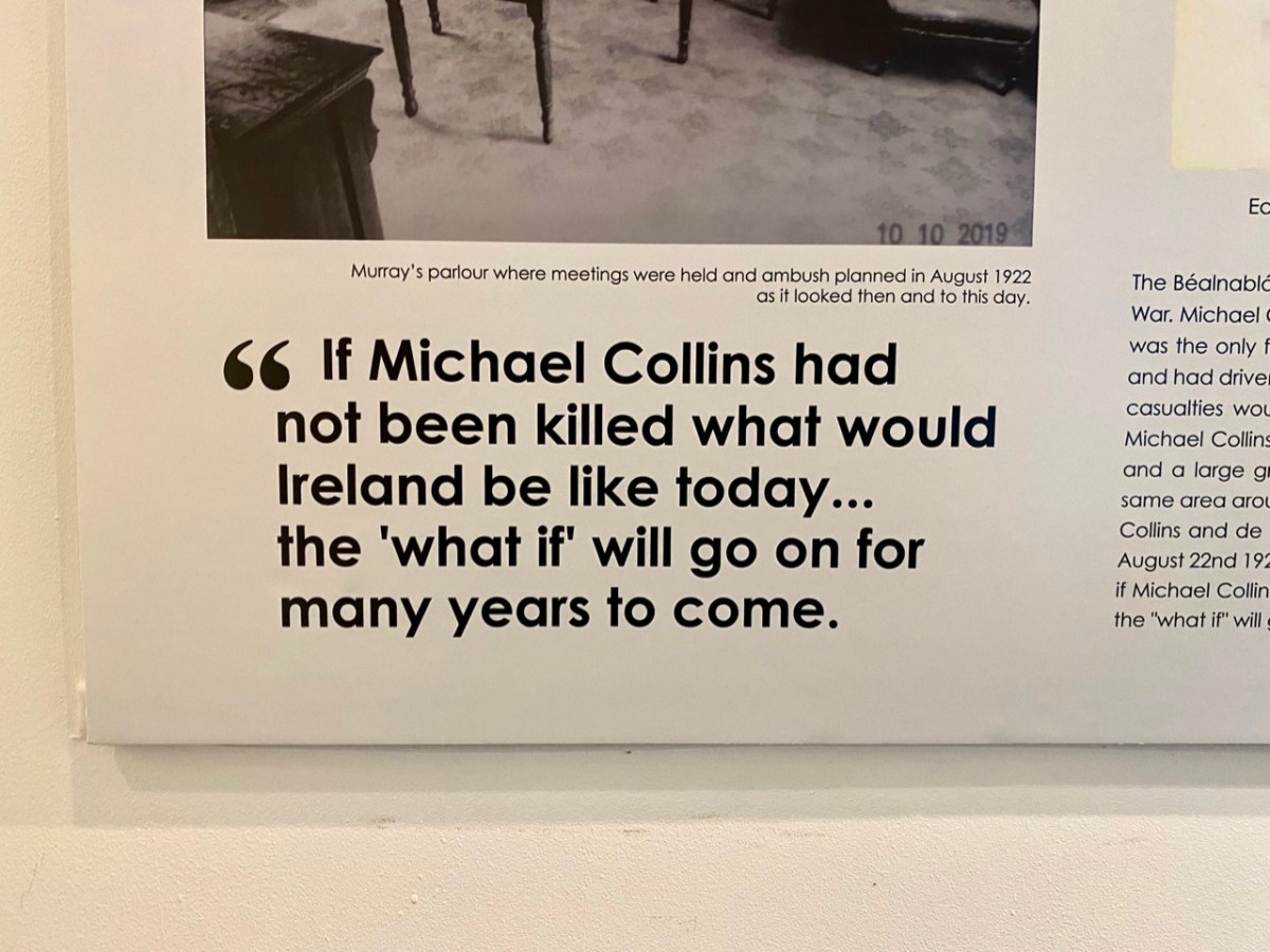 It would have been hard to miss the centenary of the death of Michael Collins over this past week. He was killed at Béal na Bláth, West Cork on 22 August 1922, during the Irish Civil War. His passing – and his life – has been the stuff of legend ever since. He’s buried in Glasnevin Cemetery, Dublin, but the events this week were focussed on the place where his life ended – not far from where we live.