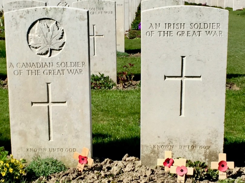 Tucked away in burial grounds around Ireland are the graves of those who died in Europe between 1914 and 1918 in that awful war – and of those who died subsequently as a result of injuries and mental stress arising from the war. We mark them out on our travels around the country. The graves – erected by the Commonwealth War Graves Commission – are of a distinctive uniform design, originated by the architect Edwin Lutyens (who also designed the great Thiepval Memorial in France, the largest Commonwealth memorial to the missing in the world, inscribed with over 72,000 names). The sheer magnitude of that number – people of whom no trace is left other than a name carved on stone – is bewildering. The image below of Thiepval is courtesy of the CWGC.