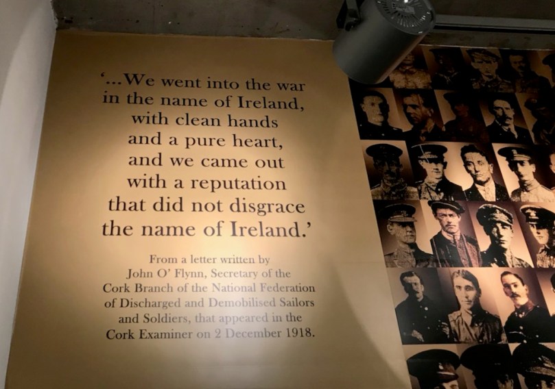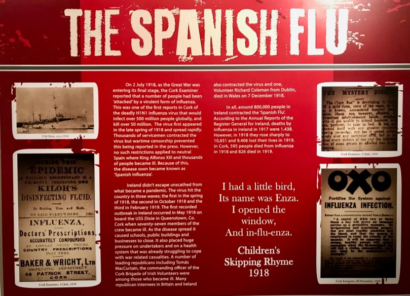 Last week saw the opening of a new exhibition at the Cork Public Museum – Cork 1918: Victory, Virus and Votes. There are photographs, posters and artefacts – all very well displayed – telling the story of the involvement of people from Cork in the Great War, the political fallout from the War and the aftermath of the world wide Spanish Flu epidemic which claimed millions of victims. It’s a must-see exhibition and congratulations are due to Dan Breen and his dedicated team at the museum for bringing it to fruition at this appropriate time. The images above and below are from the new exhibition.
