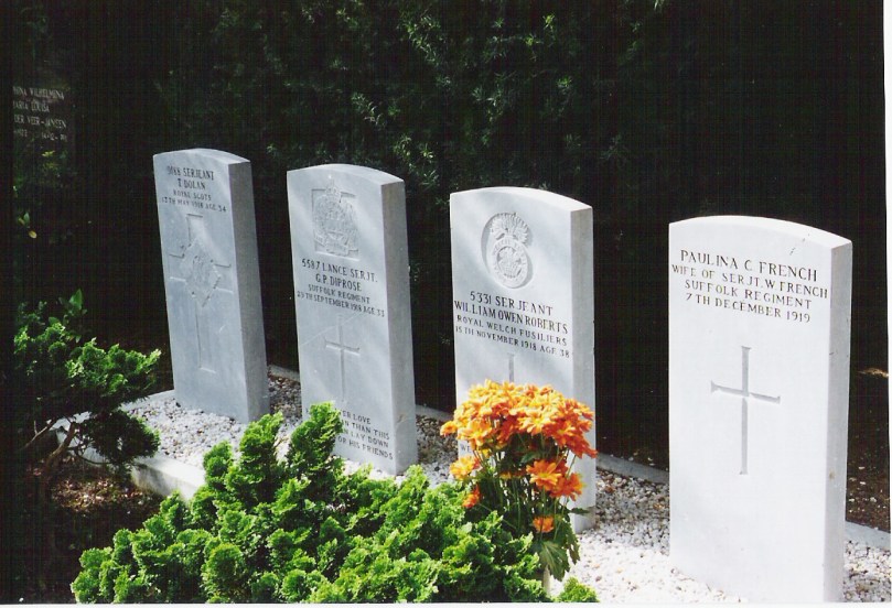 Today Finola is thinking about her grandfather – Sgt William Owen Roberts – who served in the Welsh Fusiliers and had a distinguished military career which included the Boer War and the Chinese Boxer War. He served in the Great War and was captured and interned in Germany and Holland. He contracted and died of the Spanish Flu on 15th November, 1918 – just a few days after the end of the conflict – at the age of 39. His grave is in The Hague.