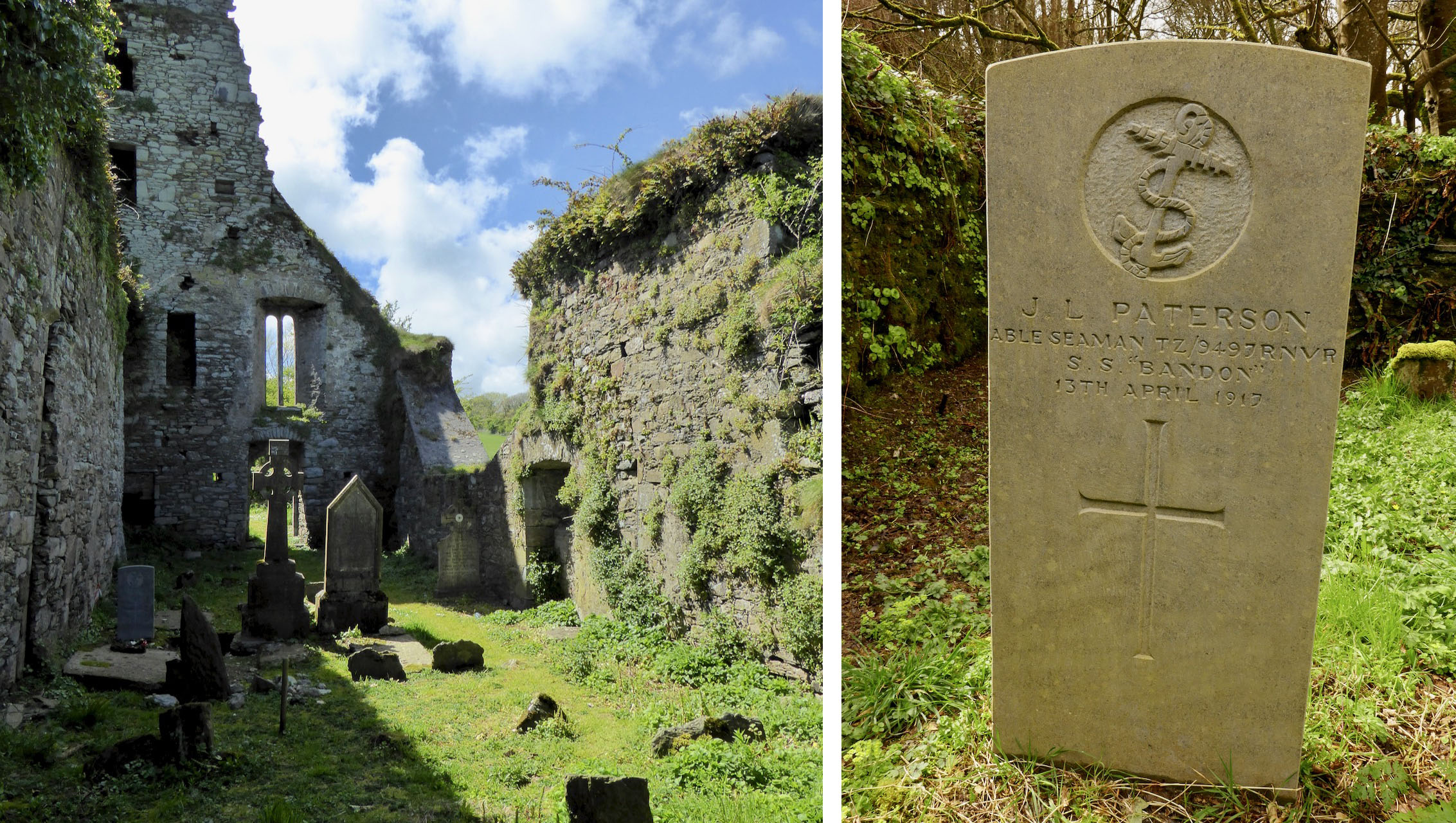 Above: two tucked-away West Cork war graves. The left-hand picture has an example, lower left, and is at Abbeymahon Graveyard, Courtmacsherry. On the right is an example at the ancient burial ground of Castlehaven.