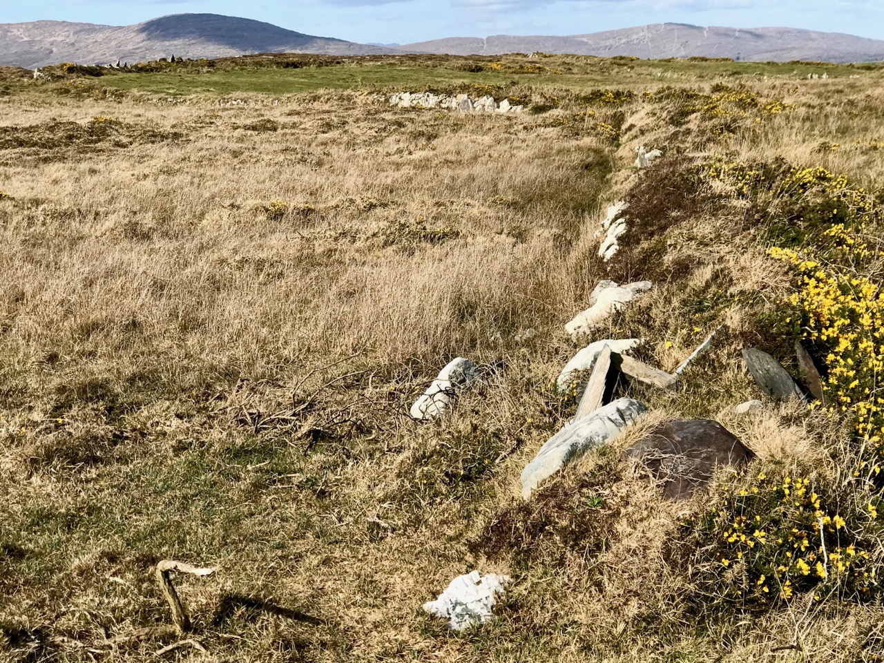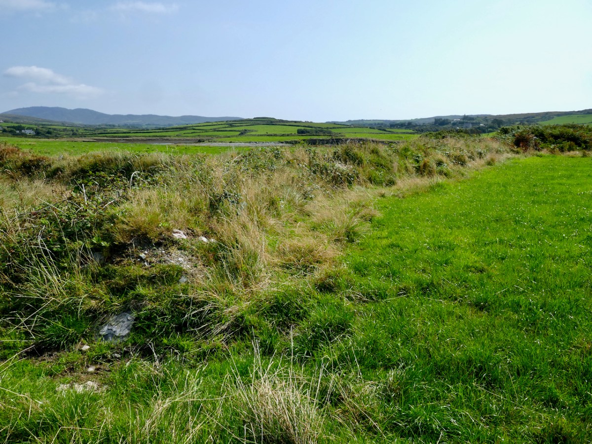 But whatever Knockeens was – a cliff-edge fort or a ring fort – it’s unusual and impressive. It consists now of a raised platform of earth, probably originally circular, and an outer wall (above). There may have been a radial wall once (see the map below), but it has been ploughed out and is no longer visible on the surface, although it shows up faintly in aerial photographs. There may have been a fosse, or ditch around the outer wall also – slight traces of this also remain.