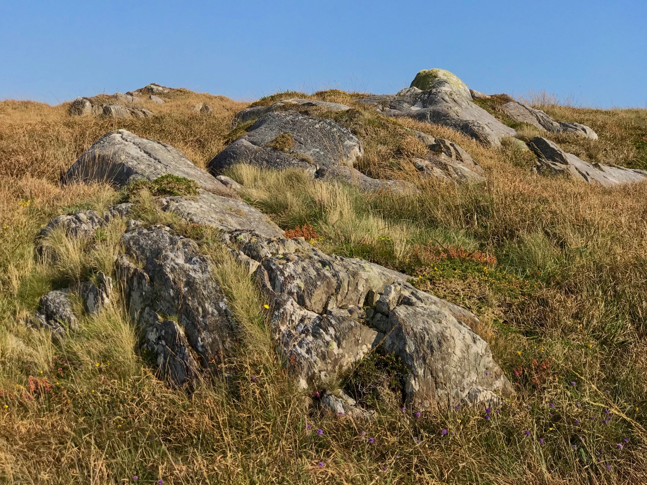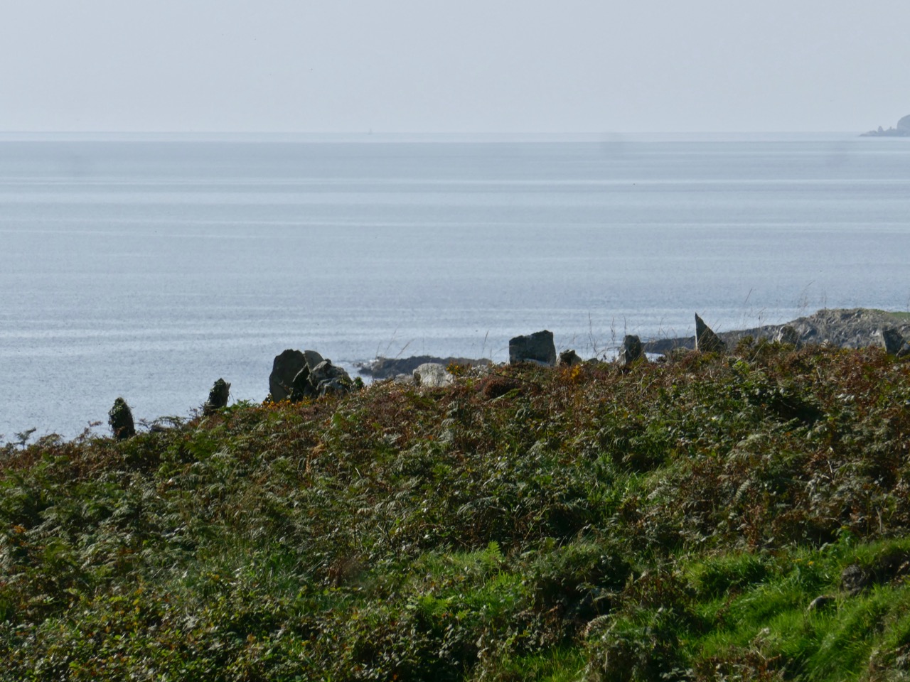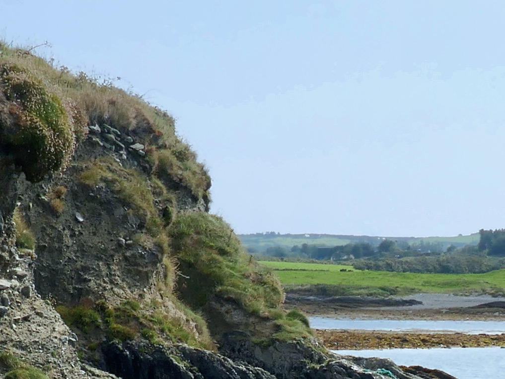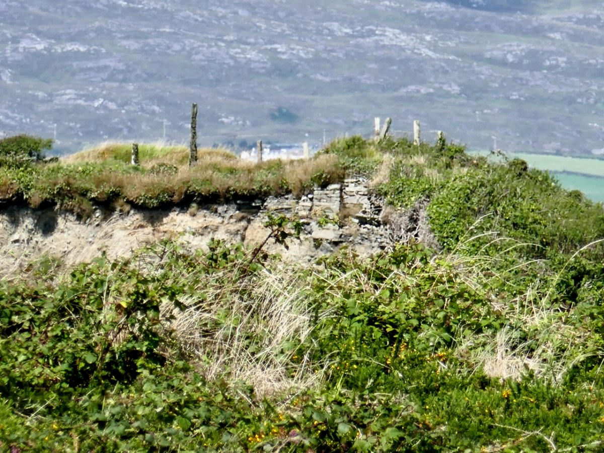 The problem is that some of these may genuinely be a specific type of fortification that uses the cliff-edge as an impregnable barrier – as promontory forts do, for example. Some of them, however, and this may apply to Knockeens, may have been circular ring forts, built on prominent locations to command views of land and sea, but which may have been eroded by sea-action until what is left is clinging on to the edge of a cliff. In the photo above, you can see the obvious erosion at Knockeens. Instead of a circular ring fort, what remains looks D-shaped.