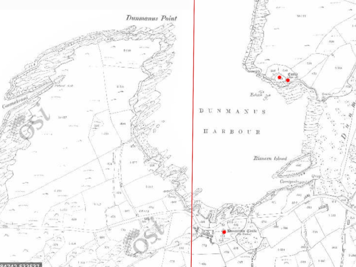Although we could not find a way to get at it from the stony beach below the cliff edge, we could just about make out, from Dunmanus Pier across the bay, a cross-section of stone wall where the platform meets the cliff. In one of the older maps, this is marked as a “Castle in Ruins” although all that is shown is a portion of wall. So there may well be a solid basis for the belief that this was the original site of Dunmanus Castle.