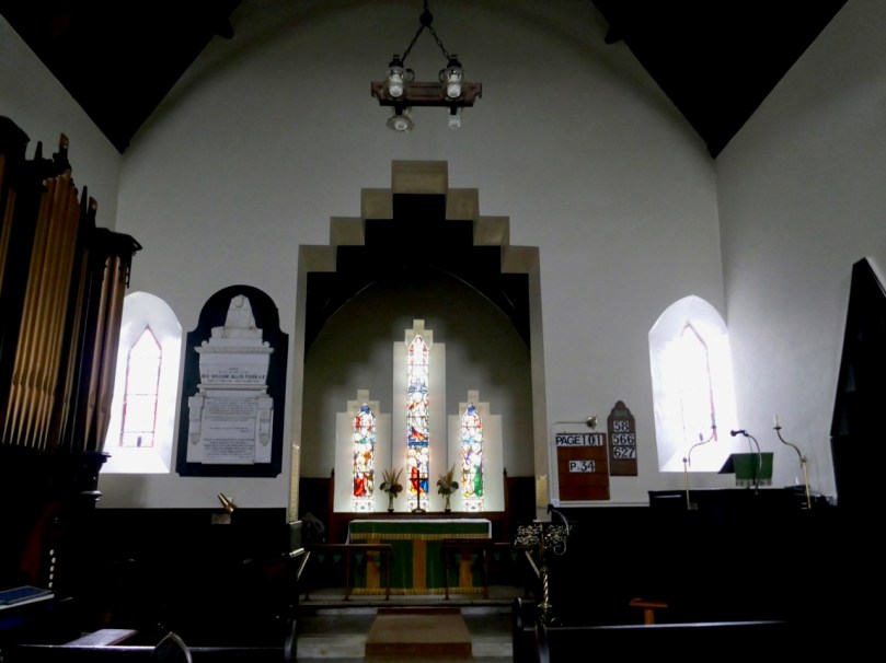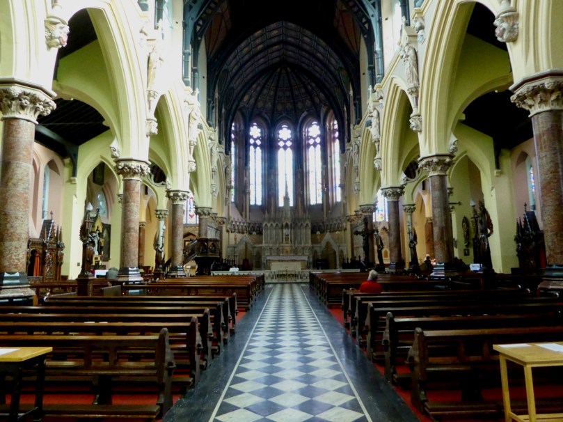Stained glass and statuary of the period is a fascinating mix of the continental (the Italian holy statue factories must have been doing a booming business) and the local, as priests incorporated their own parish and diocesan patron saints into the overall decorative plan. Killarney Cathedral, started in 1842 but interrupted by the Famine, was ready for worship by 1855. Decoration was added as time went by, including a set of windows clearly designed with an Ultramontanist message in mind – they draw clear parallels between Irish saints and martyrs, the life of Christ, and the ultimate authority of Rome. It’s quite a demonstration of verbal and visual sleight of hand, and a powerful message to the congregation.