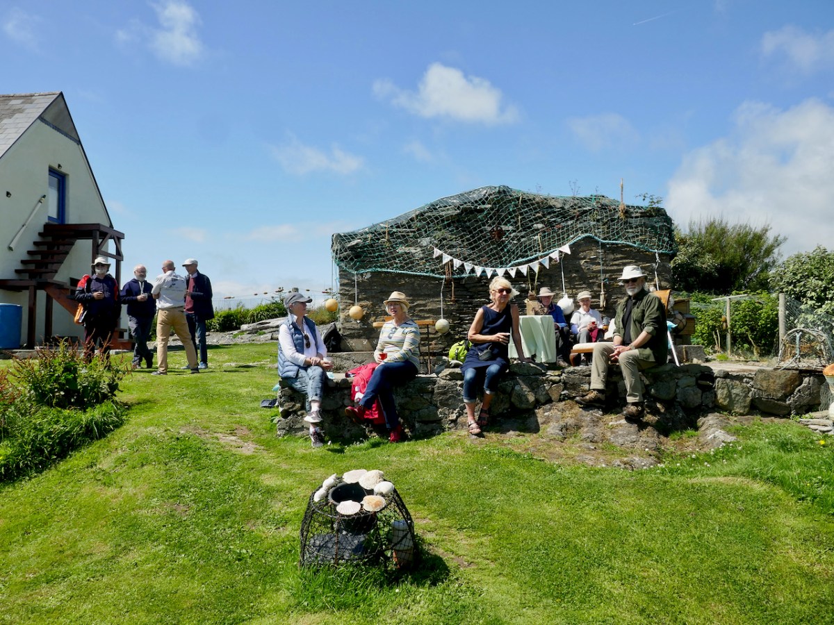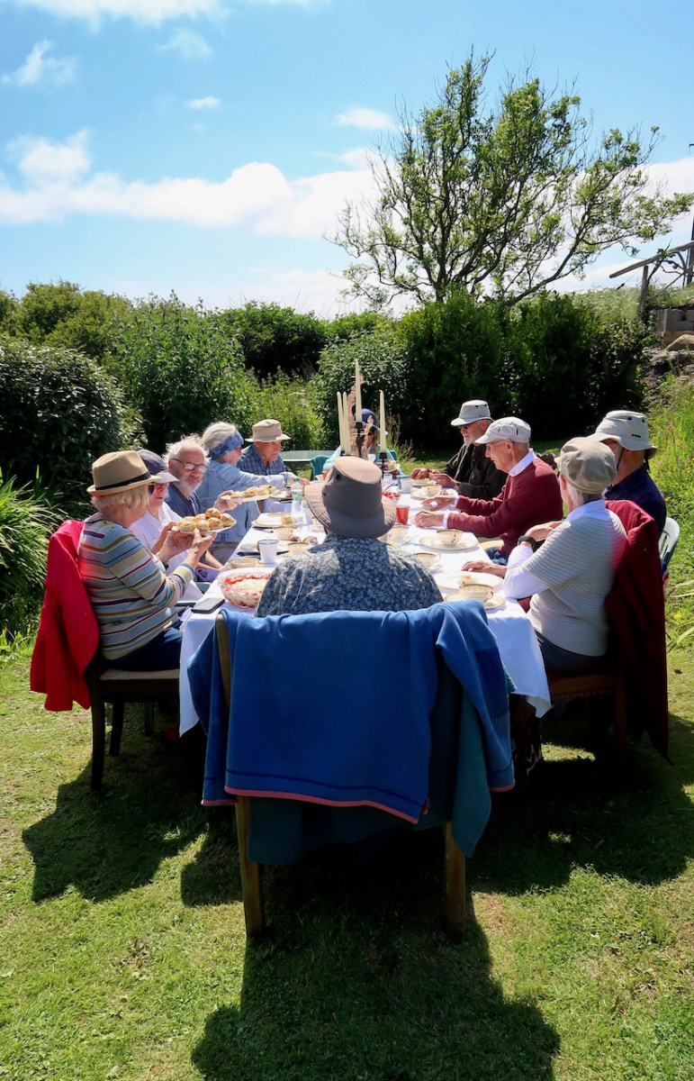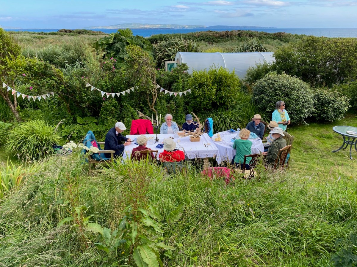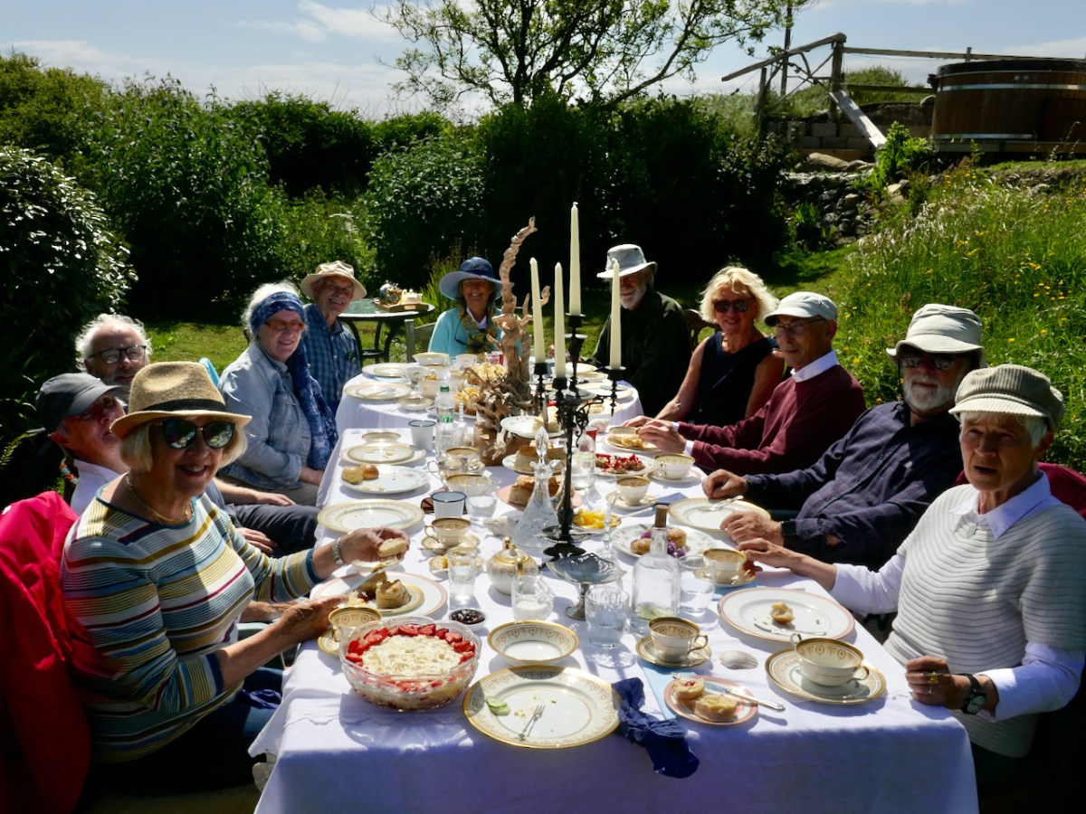 Our destination on this Easter Sunday was Castaway East – the furthest house on the ‘Easter’ end of the island. We have taken you there before, when we organised a Mad Hatter’s Tea Party in July of last year. The hosts there are Tracy and Peter, who served us brilliantly for that occasion, and also for the Wildflower Walks which Finola led last June: the Castaway crew provided a superb picnic for everyone, delivered to us at the island’s western end. This time we decided that we would test Tracy and Peter’s skills by ordering up an Easter Sunday lunch to celebrate a ‘special’ birthday for our good friend, Peter Clarke.