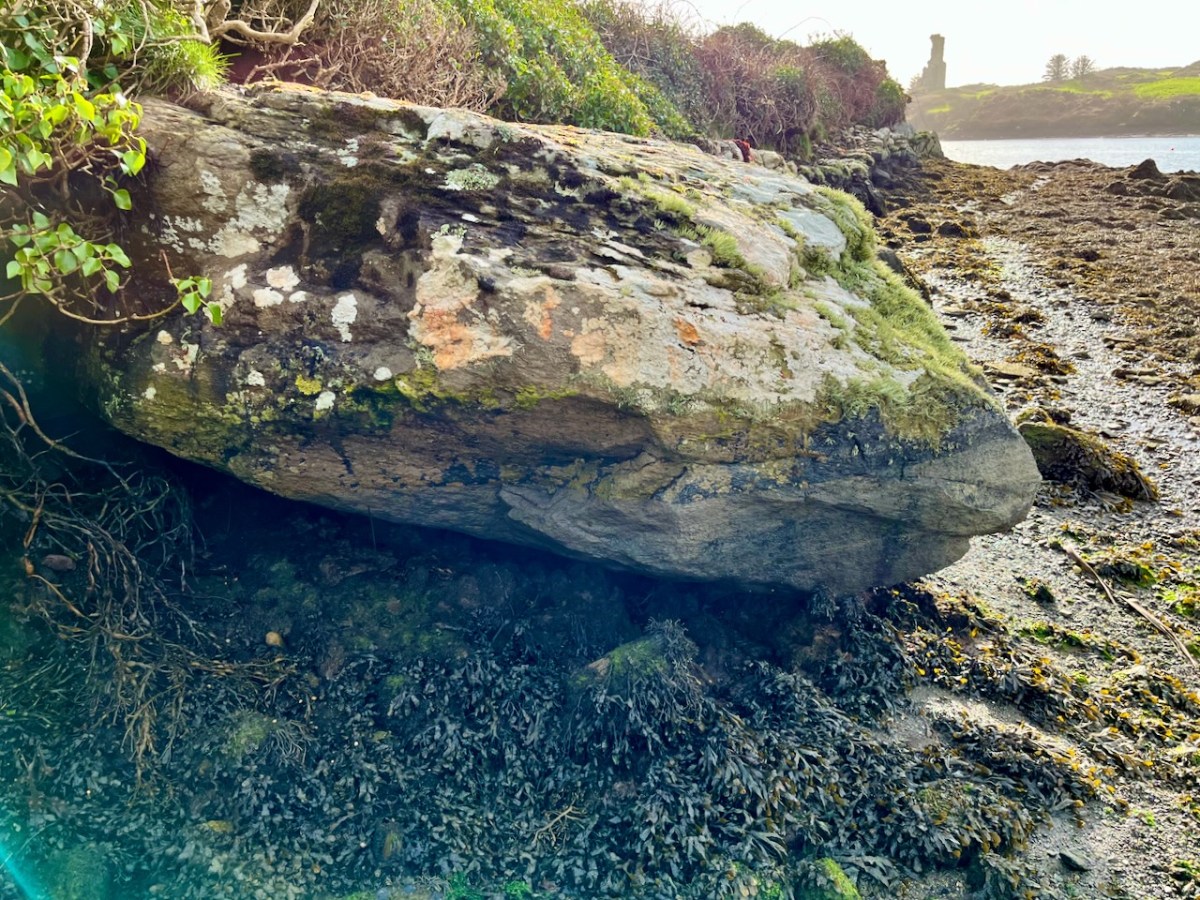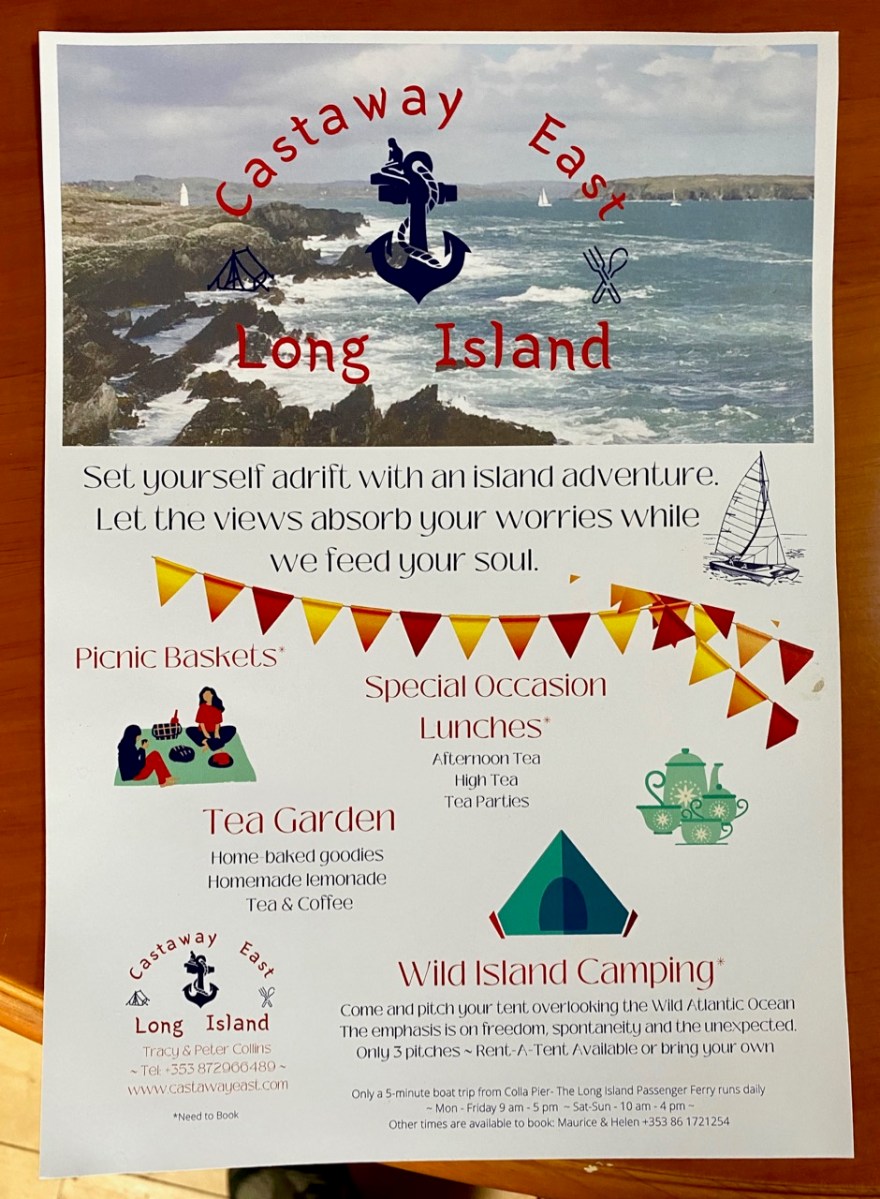 Every personal library in West Cork, maybe in Ireland, has a copy of the book The Coast of West Cork by Peter Somerville-Large. First published in 1972, it is a classic of travel writing – amusing, learned, thoughtful – that still holds up as a fascinating portrayal of this part of the world. The photograph above is of the front cover of the book, signed by the author, that I brought with me to Canada when I emigrated in 1974. Forty years later, I am living on the very spot where this photograph was taken! It took me a while to figure this out, as the picture is actually reversed. [EDIT: note that when this photograph was taken, in 1970, the castle was still intact – most of it collapsed in a storm in 1974. For what it looks like now, see Robert’s 2020 post, The Castle of Rossbrin.]