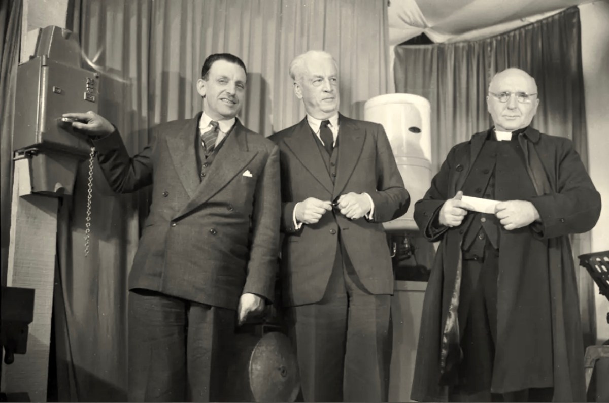 (Above) Seán Lemass – Minister for Industry and Commerce – performing the formal ‘switch-on’ in Ballinamult Creamery (Co Waterford) on 1st March 1954. This was the Electricity Supply Board’s 100,000th customer. Also in attendance are Mr R F Browne, ESB Chairman, and The Very Rev Father Walsh, PP Ballinamult.