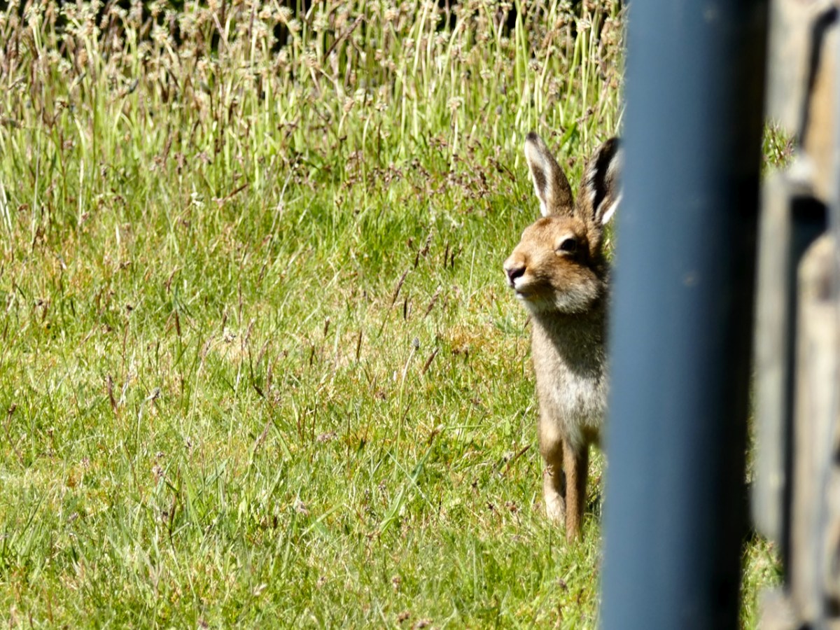 We named this little hare Berehert, after an Irish saint we were researching at the time, and wrote a post about him here. In fact, hares seldom stay in one place for very long – it’s part of their self-protection mechanism to be always on the move. And they do move: they are our fastest mammal and can outrun everything else. Since Berehert departed I always harboured a little fantasy (should we say conviction?) that he would one day call in again to let us know how he was getting on… Very nicely, thank you, would seem to be the order of the day if it is, indeed, Berehert who has come along to test out our lawn – this animal appears to be in fine condition.
