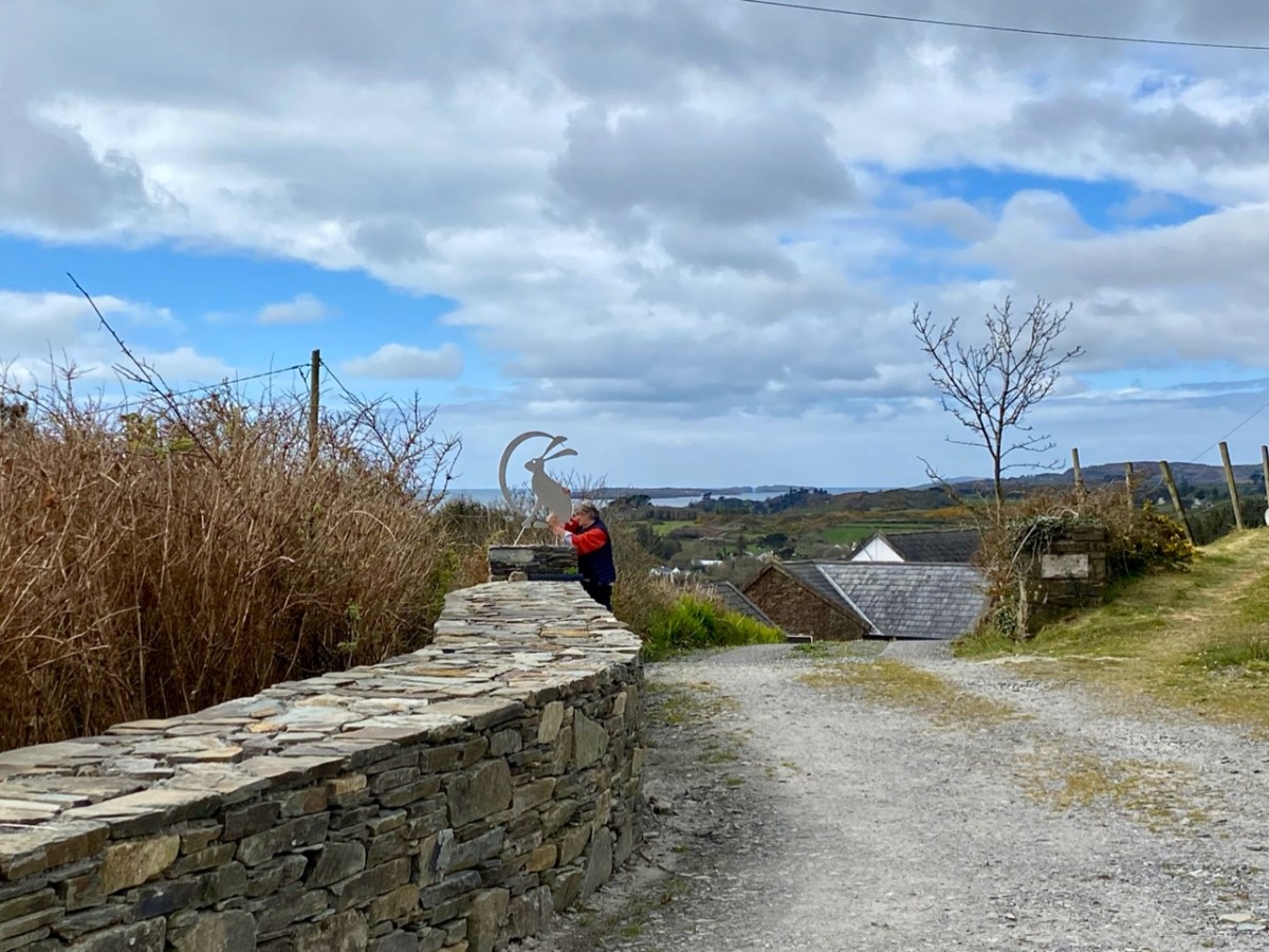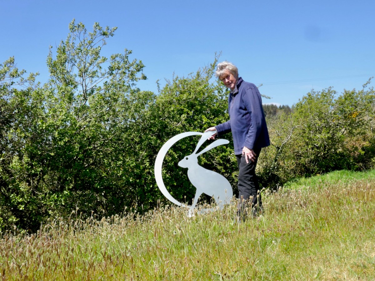 But maybe there’s another reason why this handsome hare has decided to honour us with his presence: could it be the new sculpture which has appeared in the garden? It is temporarily lodged down by the hedge (header picture) but it has been expertly laser cut from stainless steel (by Pre-Met Fabrications of Cork City) to grace our recently built stone gatepost at our entrance. My design for this hare incorporates the moon, because in folklore all around the world the hare is associated with the moon; it’s artistic licence that I have exaggerated the length of the ears (thereby making this a Brown Hare rather than an Irish one!) but the ears of hares are such defining features that they ought always to be fully celebrated.