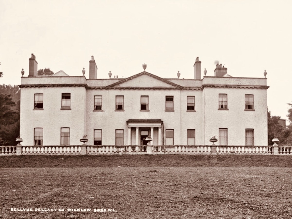 . . . The estate at Ballydonagh comprised 300 acres, with fine views across the Glen of the Downs and towards the Irish Sea. David, the younger La Touche, built his favourite country retreat here between 1754 and 1756, at a cost of £30,000, and called it Bellevue. Beautiful gardens were laid out with winding paths and “extras” built by David and his son, Peter, when he inherited in 1785. Among these was the Octagon, built in 1766, with a panther on springs, which could be made to jump out at unwary visitors. The house was most famous for its huge glasshouse, built between 1783 and 1793, in which many exotic plants were grown . . .