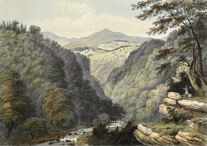 The beauty of this part of County Wicklow has been celebrated by many artists over the years: here are a couple of examples from the late 1700s showing the Glen of the Downs landscape. Always, one or both of the topographical high-points – the Great and Little Sugar Loaves – are prominently featured.