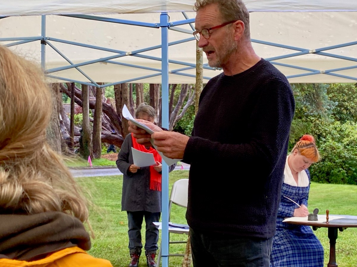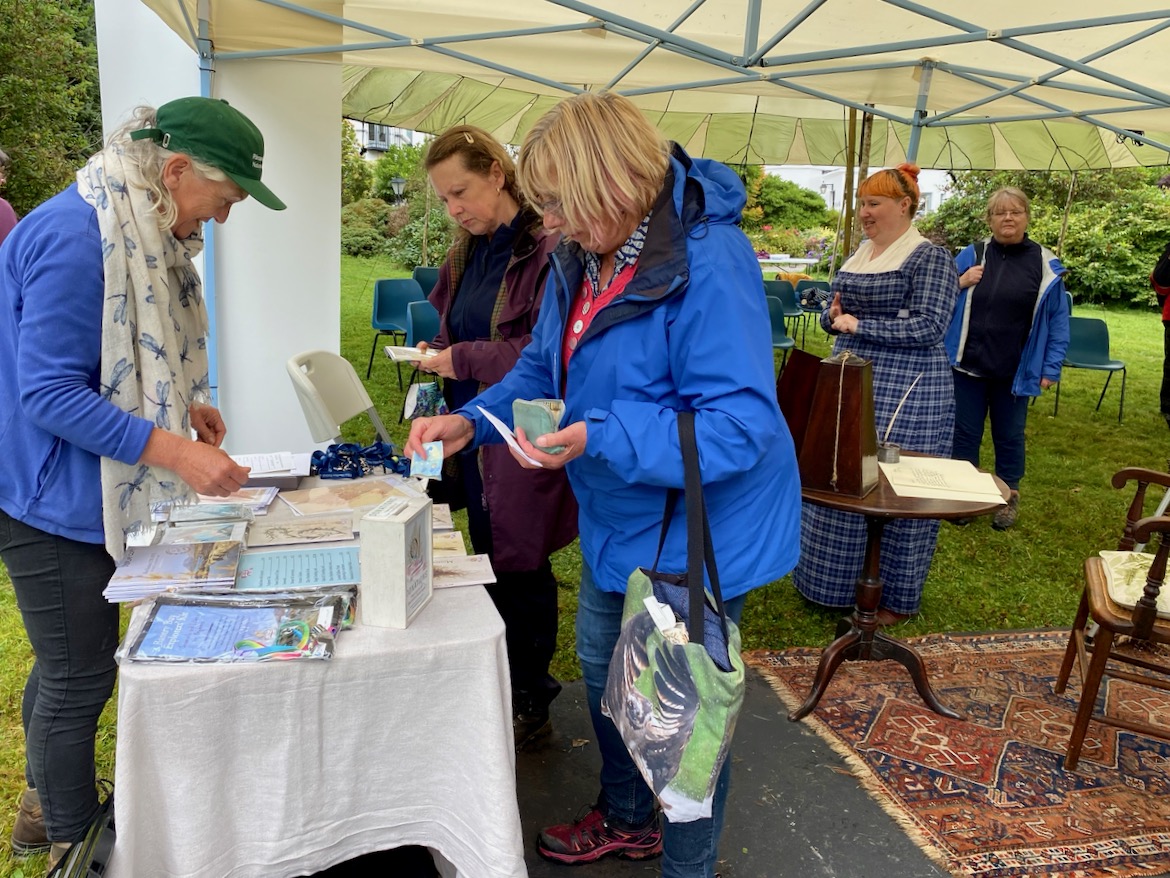 Important to our day – apart from the presenters and actors – were Madeline Hutchins (above – showing us some of Ellen’s drawings of seaweed), great great grand-niece and a co-founder of the Festival; and – behind the scenes but essential – the team, including Clare Heardman, co-founder of the Festival and a Conservation Ranger at the National Parks and Wildlife Service. Here’s Clare in action setting everything up – and running the Festival shop: