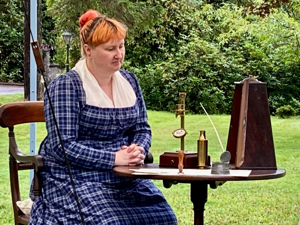 Above are the two other performers: on the right is Mark O’Mahony from Cappaghglass – he is a part-time actor, and here he reads the letters from Dawson. On his right is Carrie O’Flynn. She is a historic re-enactor and researcher: she appeared as Ellen, in authentic period dress, and provided really illuminating interpolations between letter-readings, informing us about the act of letter-writing itself in the early 1800s – the ink and quill pens; the postal service; Ellen’s probable appearance and dress (there are no surviving portraits of her) and the difficulties which Ellen would have had to face in pursuing here chosen interests, especially as she was herself quite frail and was for many years the carer of her own mother. Her achievements in the light of all this are truly remarkable, and Carrie succeeded in bringing this out with her contributions. Below she shows us the brass microscope that Ellen used – an essential item of equipment for her work.
