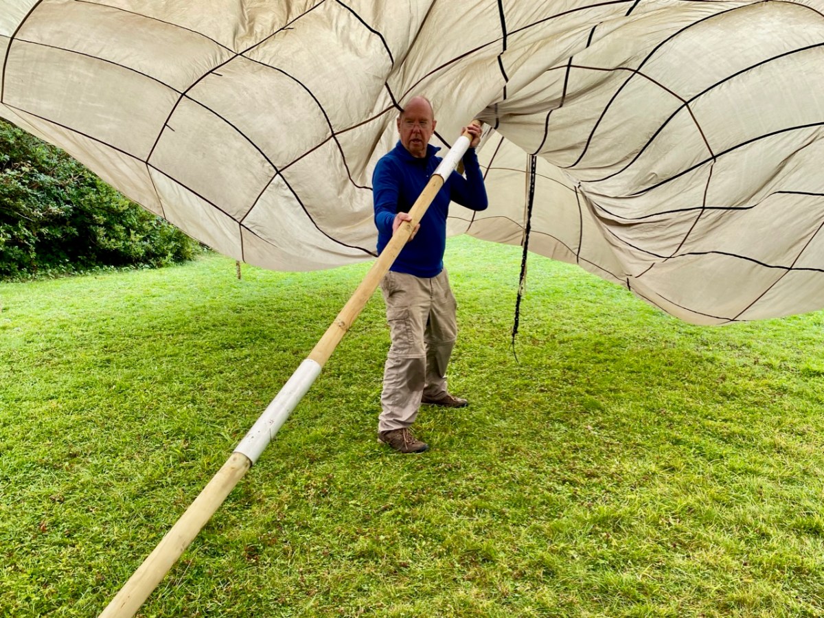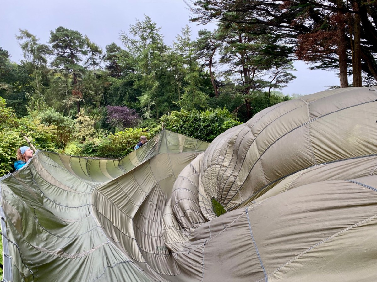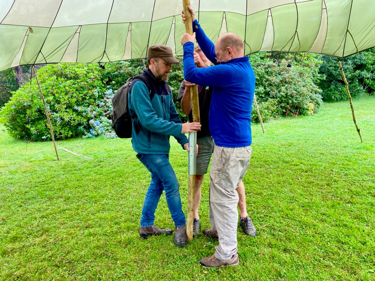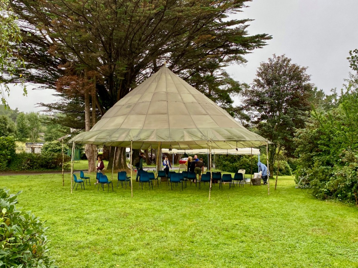 The weather forecast for that day was atrocious! Heavy rain and thunderstorms were predicted for the duration, and we set out for Ballylickey with some trepidation. However, as is often the case in West Cork, the weather forecasters were confounded. Nevertheless, the Festival team had prepared for all eventualities and we arrived in time to contribute to the setting up of a shelter made from a silk parachute and a number of wooden poles. The transformation of an empty area of lawn in the gardens of Seaview House Hotel into an impressive performance space in a very short time was quite remarkable – and a visual treat – as the swirling mass of silk was tamed by our team, directed by Seán Maskey.