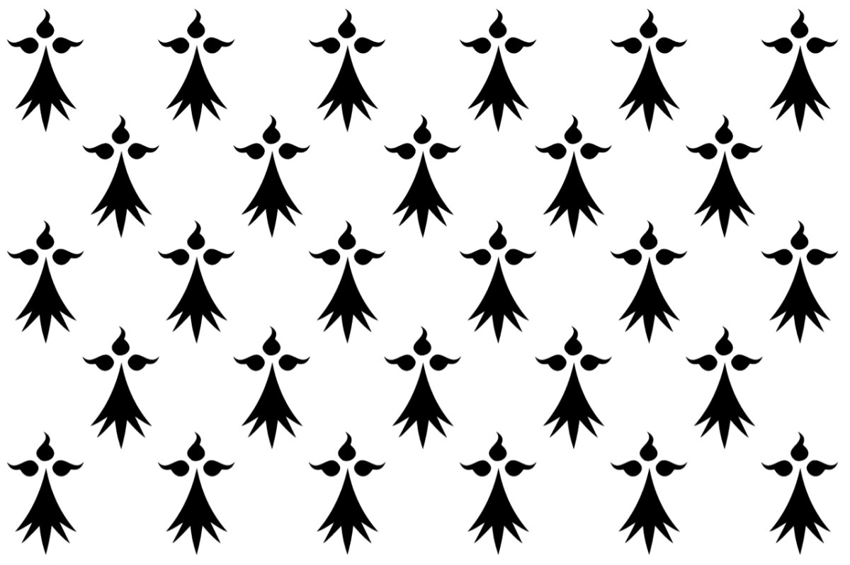 A possible reason for the attention which stoats attract in folklore is the fact that they can change colour, which adds a sense of the supernatural to them. In countries which have harsh winters the coat of the stoat becomes white in those months, offering a level of protection in the open landscape. The fur from the white – or ‘winter’ – stoat we call ermine, and the white fur is considered so precious that only royalty or nobility traditionally wear it. In the drawing above, the white stoat is wearing a cloak on which are printed the symbols of the flag of Brittany (below), which was an independent kingdom in medieval times. The white background represents the ermine fur, and the black markings are said to be based on the black tip of the tail which the animal retains, even in the winter.