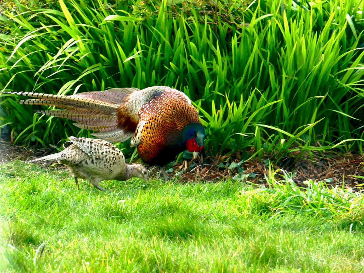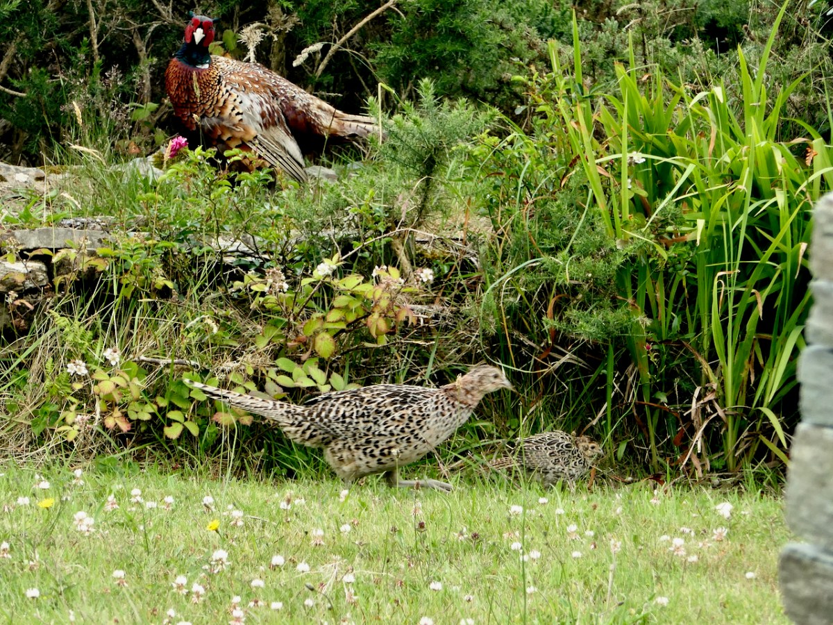 In the upper picture Finnbarr and his young wife, Fidelma, patrol our garden some five years ago. The lower picture was taken just before the start of the Pandemic, in March 2019. The couple have been a daily feature of life outside Nead an Iolair. They always appreciated feeding time, when they got a share of the seeds I put out on our patch for the many bird visitors, small and large. The picture below taken during the summer of last year shows a family group: pheasant chicks have been seen but rarely.
