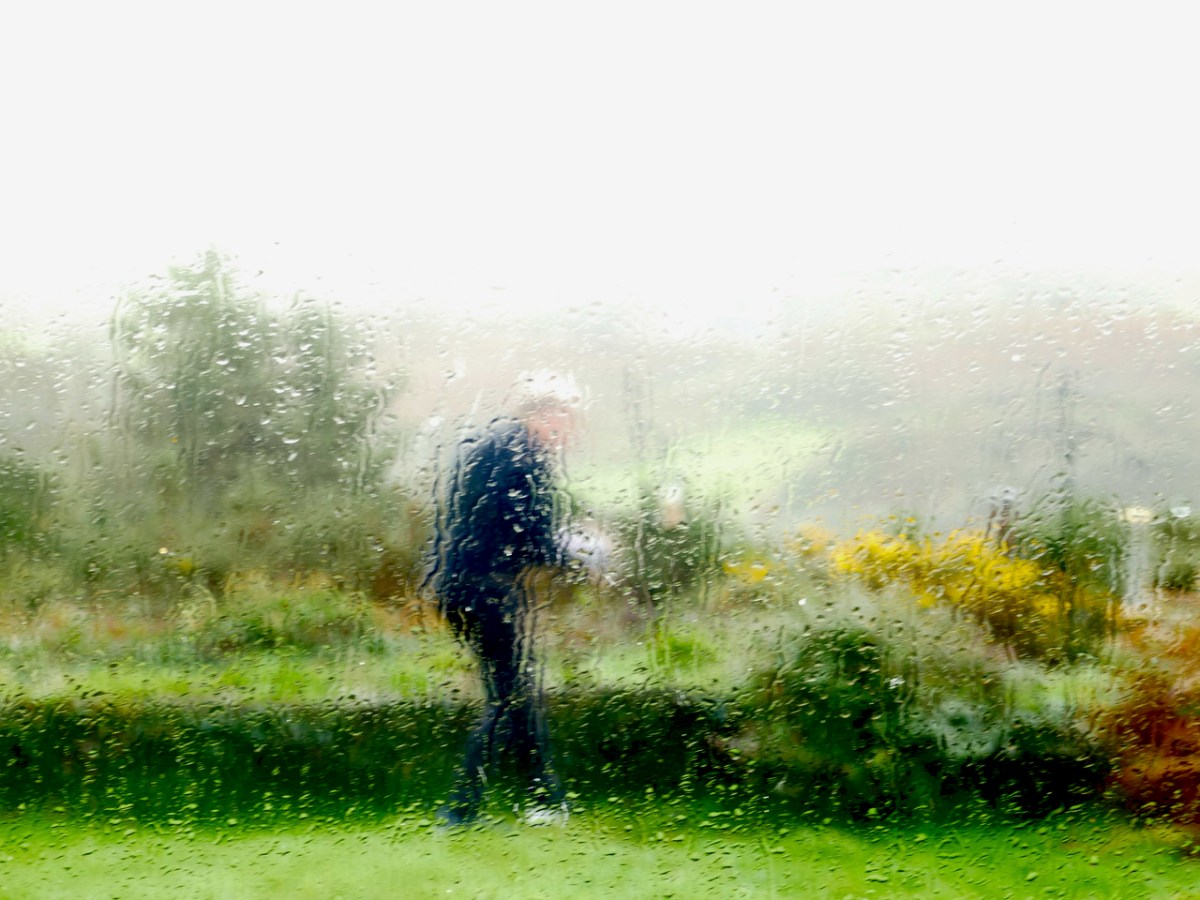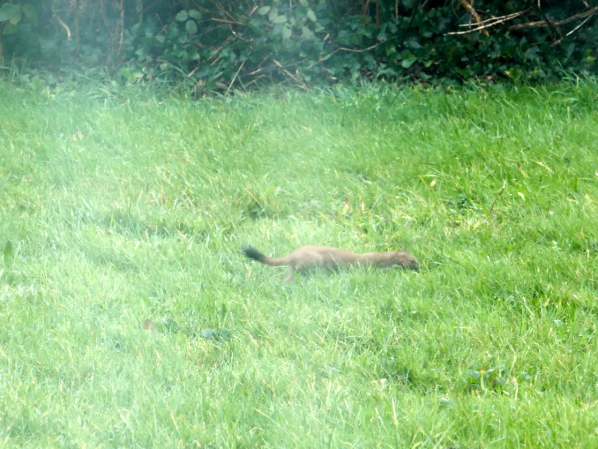 Finola has done her best to clarify the images in the photos she rapidly took through streaming wet glass (above) on this appalling day. The weather did not in any way impede the progress of the animal which circumscribed our whole acre, it seemed, in record time.