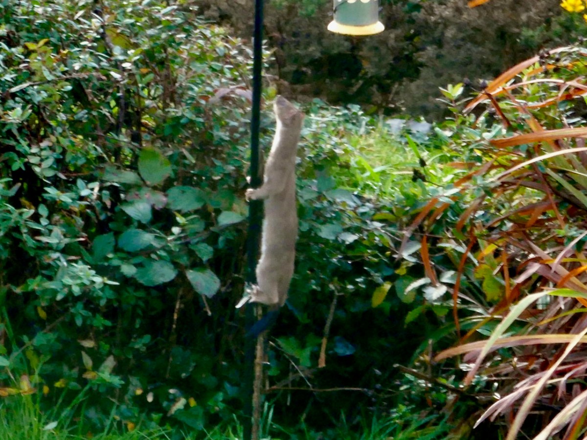 The idyll abruptly ended yesterday, when a bomb hit the garden – in the form of a small but fierce force of nature: only inches long but terrifying. I glanced out of the window where, minutes before, the two pheasants had been foraging as usual along the stone boundary wall. I was shocked to see Fidelma lying on her back, wings flapping, being dragged along the ground: there was a commotion among the small birds and Finnbarr had vanished. At first I could not see the attacker, but as I rushed outside I caught a glimpse of brown fur with a hint of white and black. My first thought – a rat! – could not have been borne out: we have lived side by side with rat families for years: they only ever appear to share the bird food, and are never aggressive.