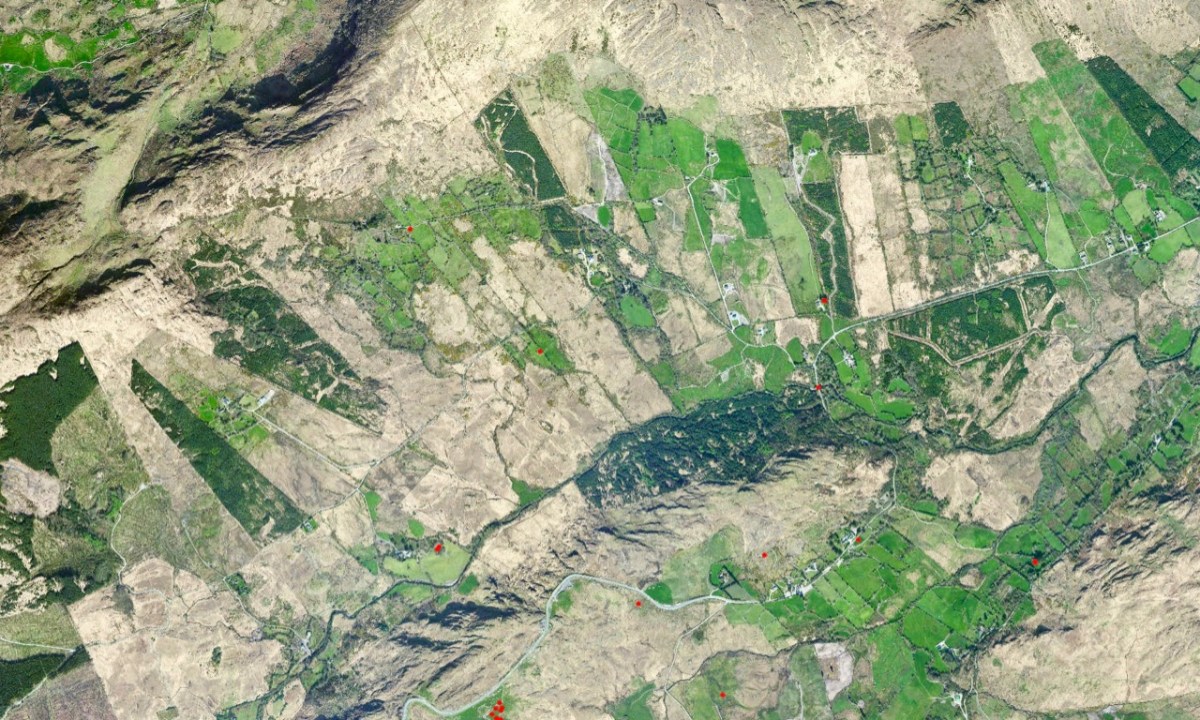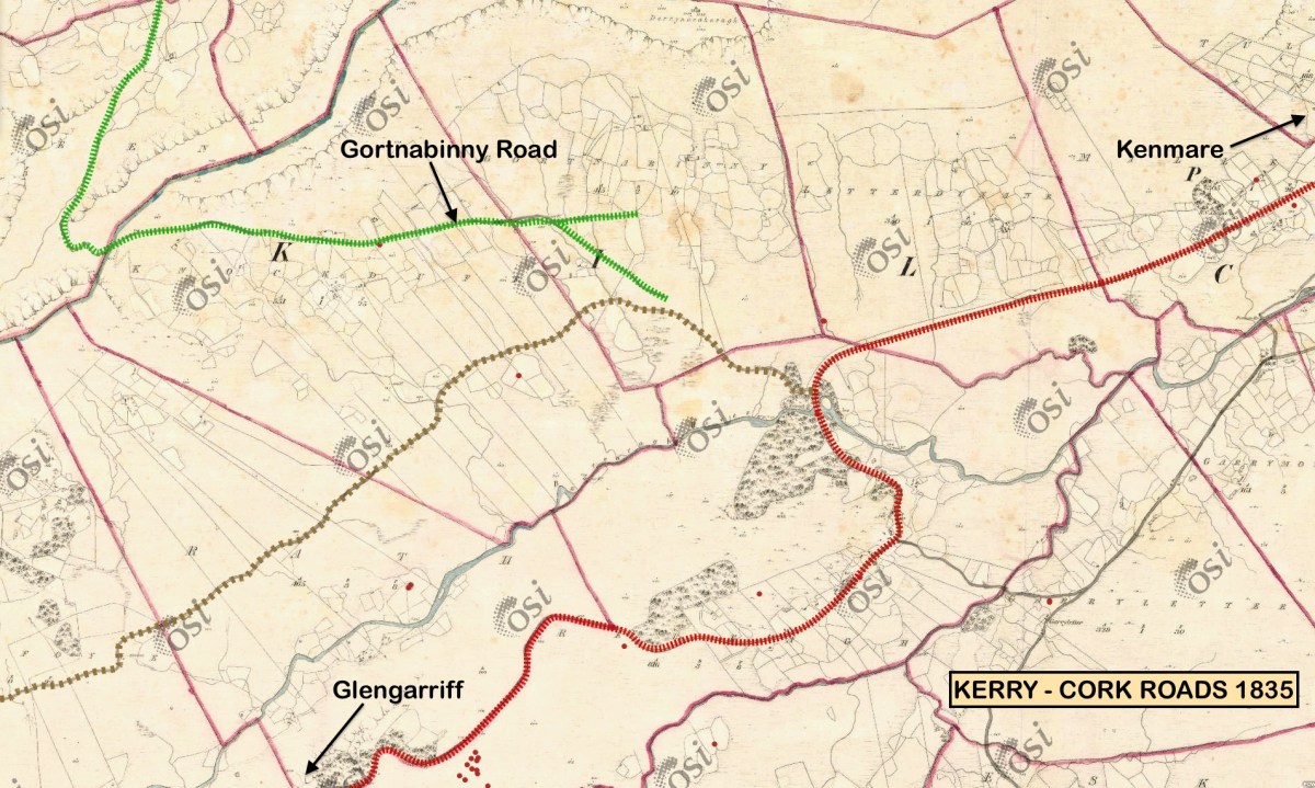 The early OS map (upper) and aerial view (lower) give an impression of the topography over part of the route. The field boundaries are fascinating – and obviously ancient: sweeping linear enclosures cascading down the slopes. From the early map we can see that the road we travelled (known in part as Gortnabinny Road – marked in green) did not actually reach the main Kenmare to Glengarriff road in those times. It presumably just served remote settlements and lonely holdings.