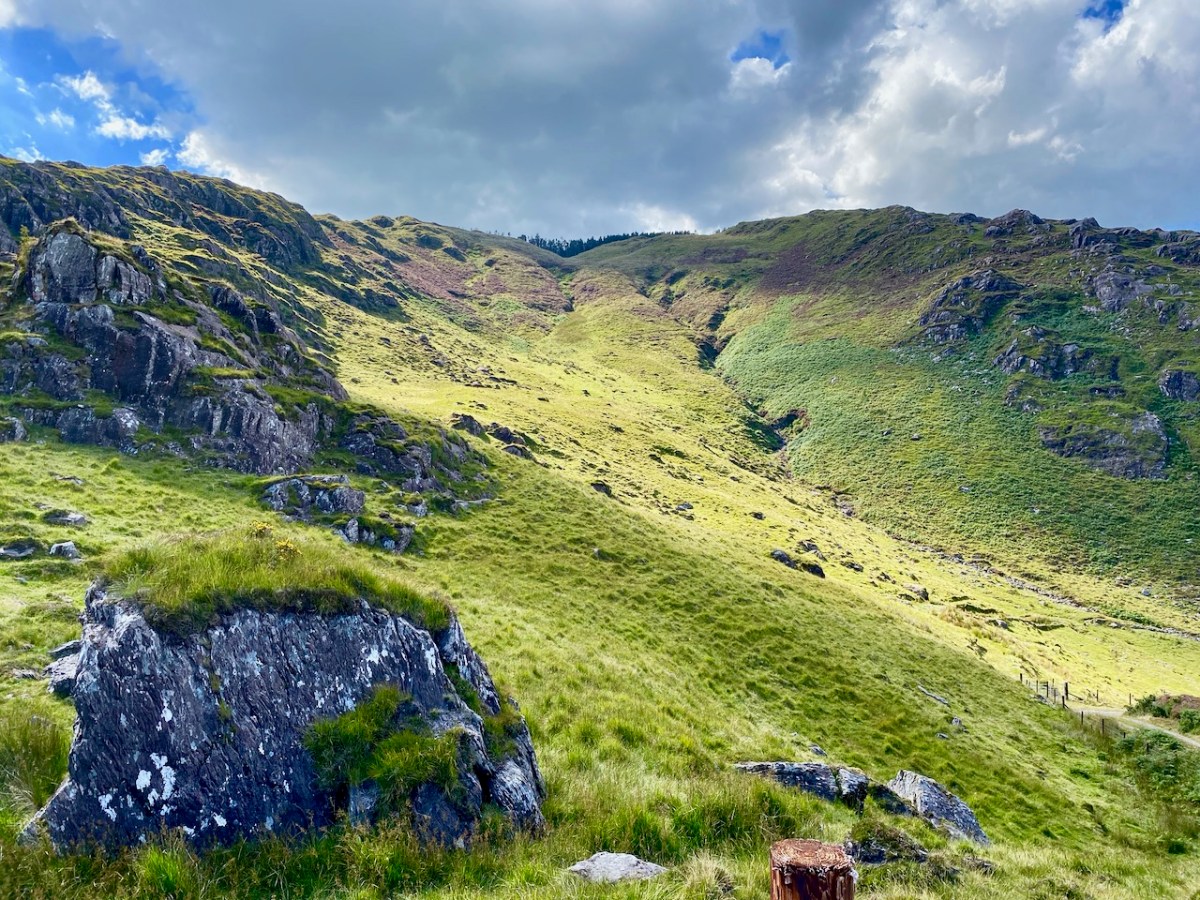 It couldn’t have been a better day for the drama of sunshine and clouds that outlined the valleys and hills. There is little sign, here, of a drought that is causing problems on farms and in town gardens. When distant views opened up, we were treated to some of the finest vistas in our counties.