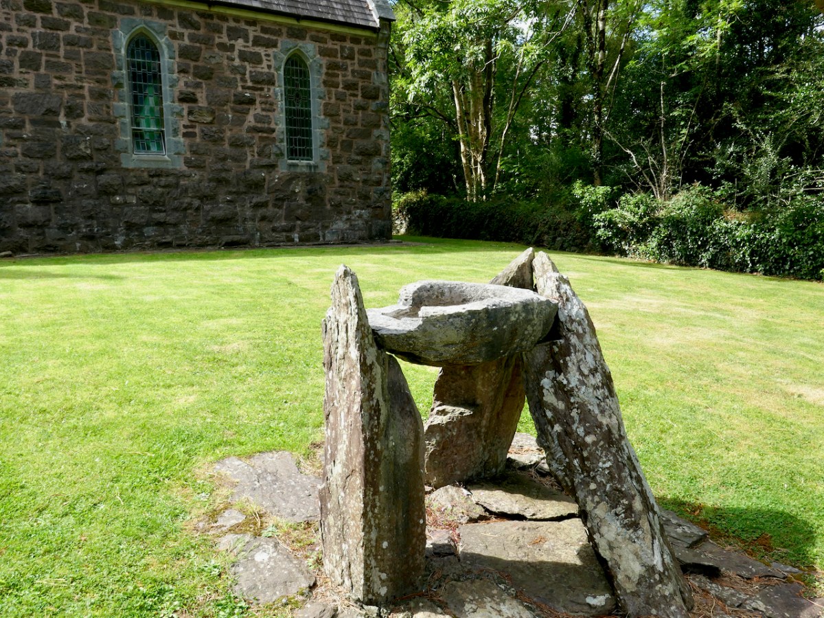 We were coming back from a day out in Kenmare, aiming for our West Cork home. There’s a corner of the Beara Peninsula – within Kerry – that we had never explored before so we headed out to revisit the little church at Dawros, Tuosist parish. We have always been fascinated by the stone basin that is in the church grounds, mounted on crude pillars – I have seen it described as a ‘baptismal font’: