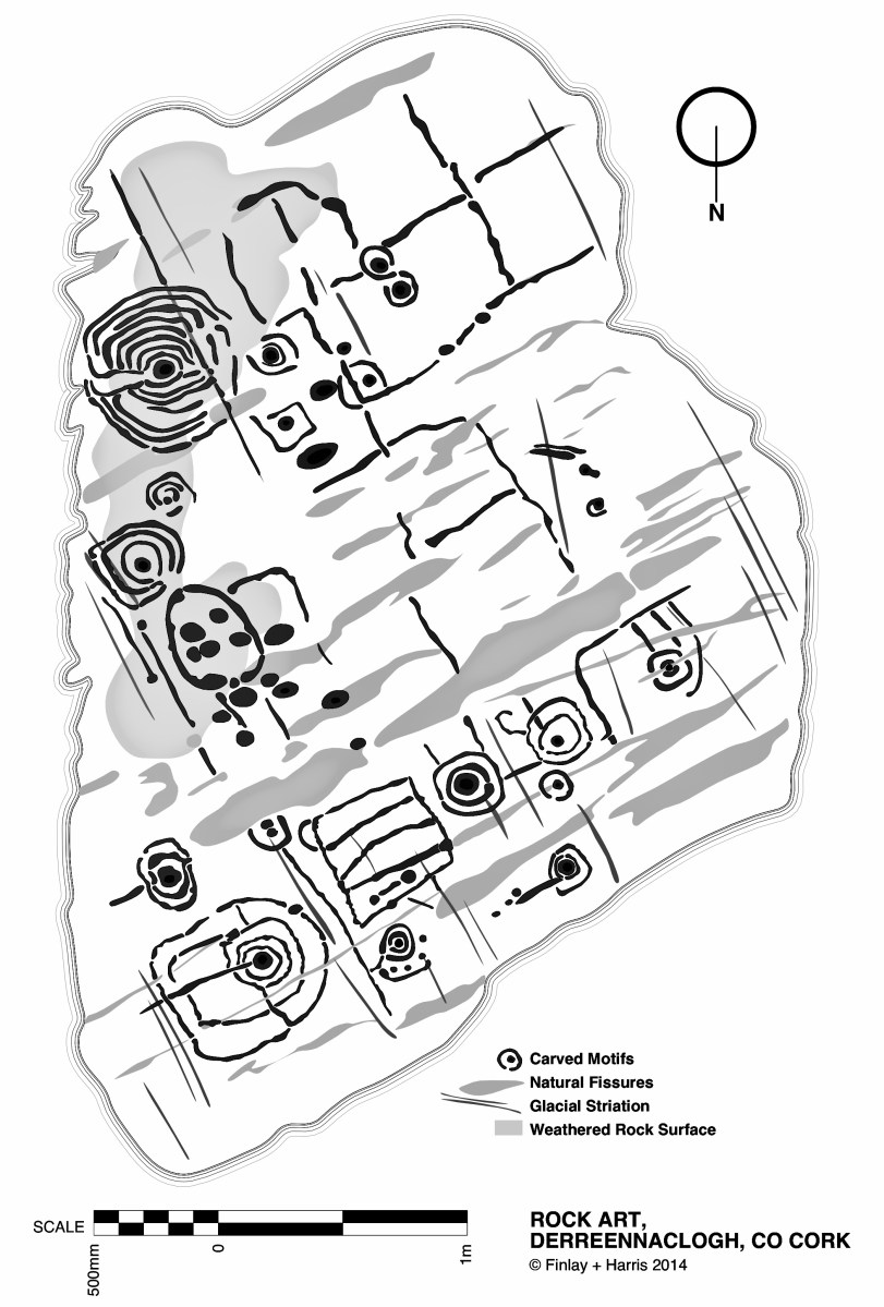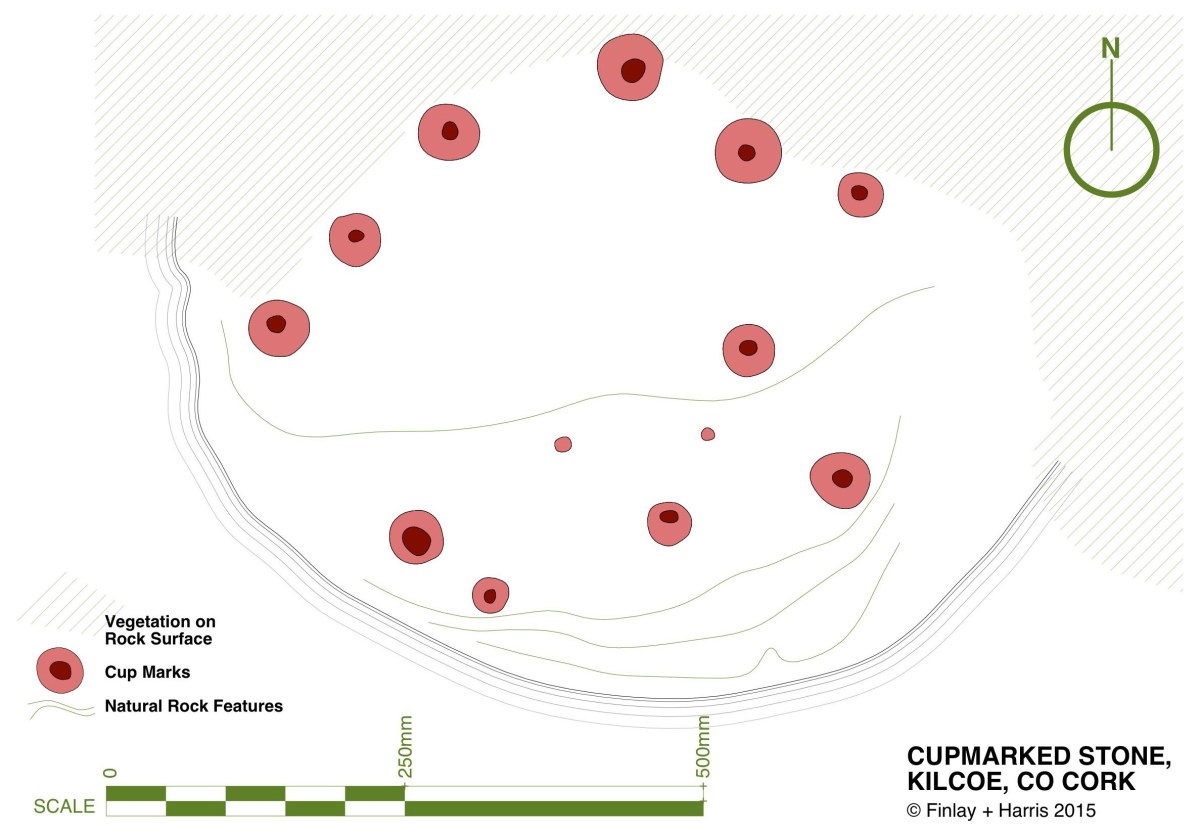This page is all about prehistoric Irish rock art. Generally now thought to date to the Neolithic period – about 5,000 years ago – rock art is found on outcrops and boulders in the Irish countryside. The central motif is the cupmark, a semi-spherical indentation that has been picked or bashed out. Cupmarks can occur alone, with nothing in the way of a discernible pattern, or they may appear to be arranged in rough lines or semi-circles. A rock with cupmarks only is labelled a Cupmarked Stone in the National Monuments record. If the carvings include other elements it is labelled Rock Art – the other elements mostly often take the form of circles, single or concentric, and straight or curved lines, occasionally arranged in patterns. Nobody knows if the motifs carry a meaning, but they persist in time (carrying on well into the Bronze Age) and space – the rock art tradition is found all over Atlantic Europe, so it is obvious that they codified or expressed something important to our ancestors.