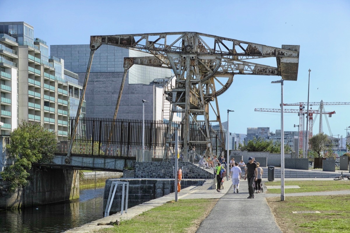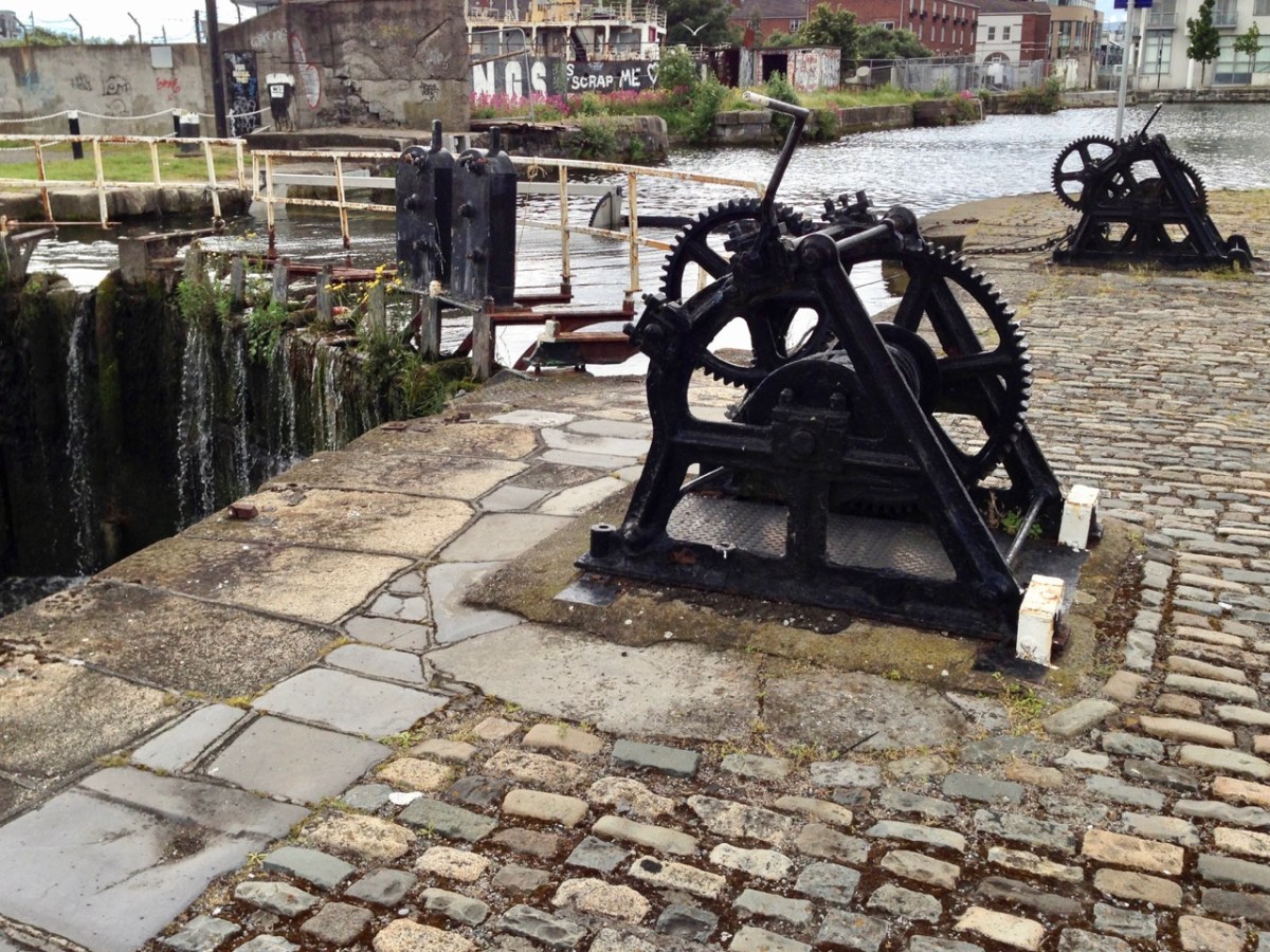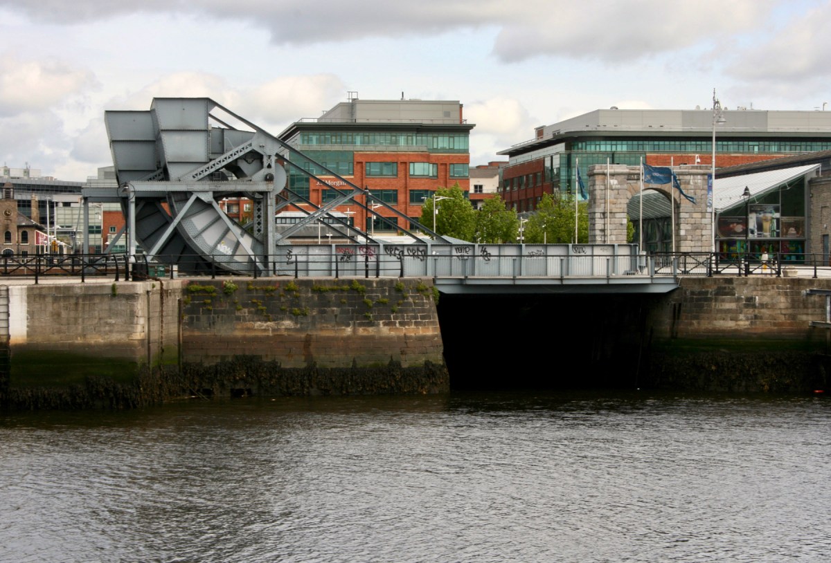 . . . The day before we were due to leave our moorings at Grand Canal Dock I thought it as well to reconnoitre the entrance from the Liffey into the Royal Canal at Spencer Dock, North Wall. The channel into the tidal lock was barred by an enormous rolling lift bridge over which an endless procession of cars and lorries was rattling and thundering. To my eyes it appeared as though this formidable barrier was seldom or never moved. In any case it seemed optimistic to suppose that this ponderous mechanism would be operated, and the traffic along North Wall suspended, merely to allow the passage of our small craft. Looking up at the dock I saw yet another obstacle; a drawbridge this time operated by two steel beams high overhead which looked at this distance, with their long rods linking beams to bridge, like a pair of slender, long-beaked birds. This carried Sherriff Street, another busy thoroughfare, across the dock . . .