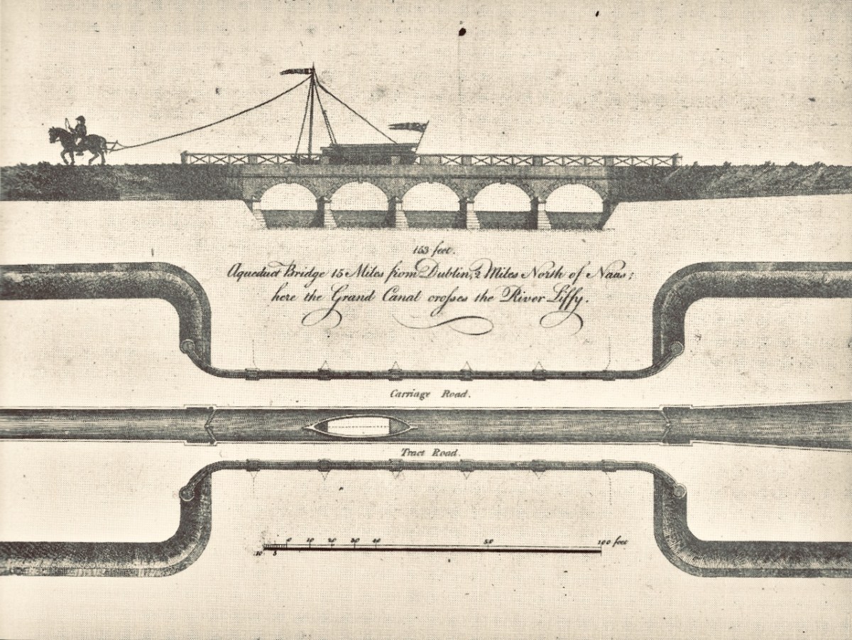 Top – early print of the Leinster Aqueduct, Grand Canal; lower – the Rolts pause to admire the structure as they cross the Liffey on the aqueduct