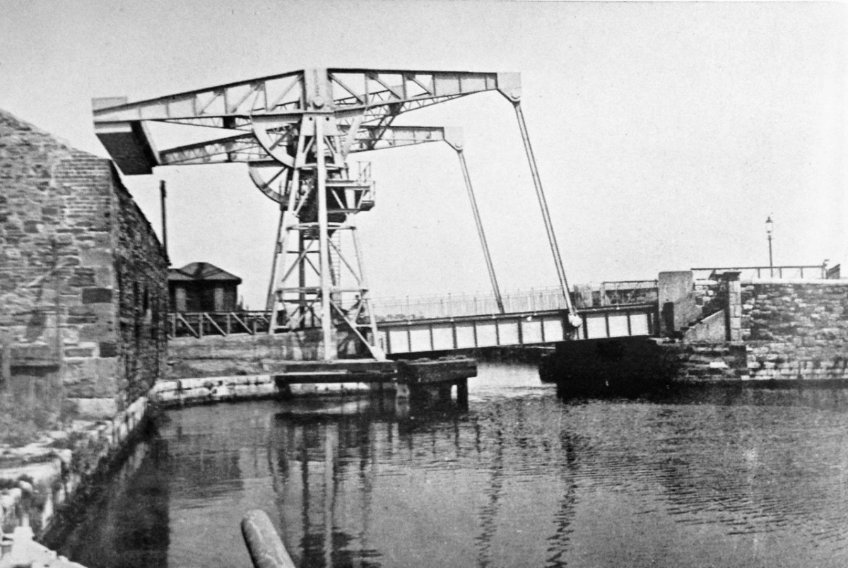 Upper – Angela Rolt’s photograph of the Sherriff Street lift bridge at Spencer Dock, Royal Canal, in 1946; centre – the lift bridge today (courtesy William Murphy aka Infomatique). Lower – the overhead beam lift bridge mechanism is a principle often found on canal navigations: here is a more vernacular example on the Barrow Navigation (from Ireland of the Welcomes, 1971)