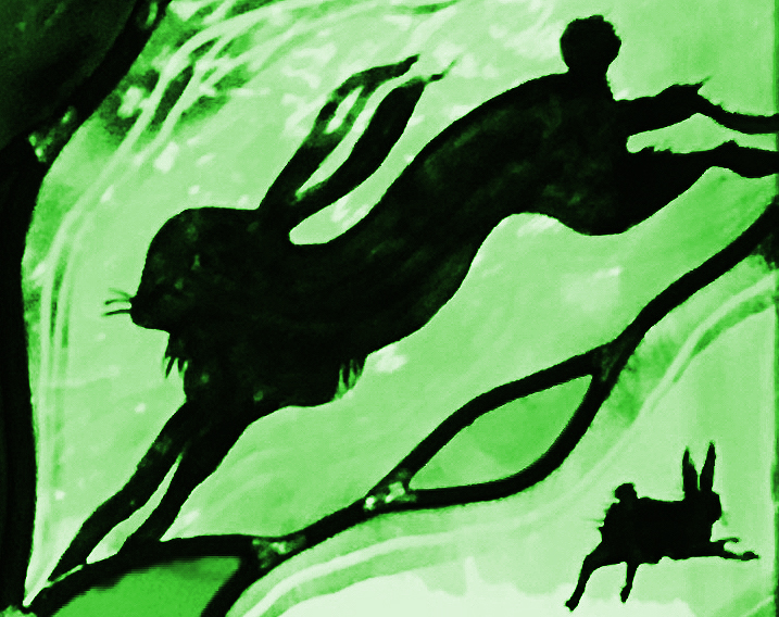 The two laid into each other with their swords and, in the shock of the fight, the giant was turned to dust. In the morning it was raining all over the woods, and Hugh spent the day wandering. As evening fell, what should come to him but a hare? He took his horse and released the hound and the hawk but the hare outran them all and disappeared into a small cottage in the wood. “Why wouldn’t I go in?” said Hugh.