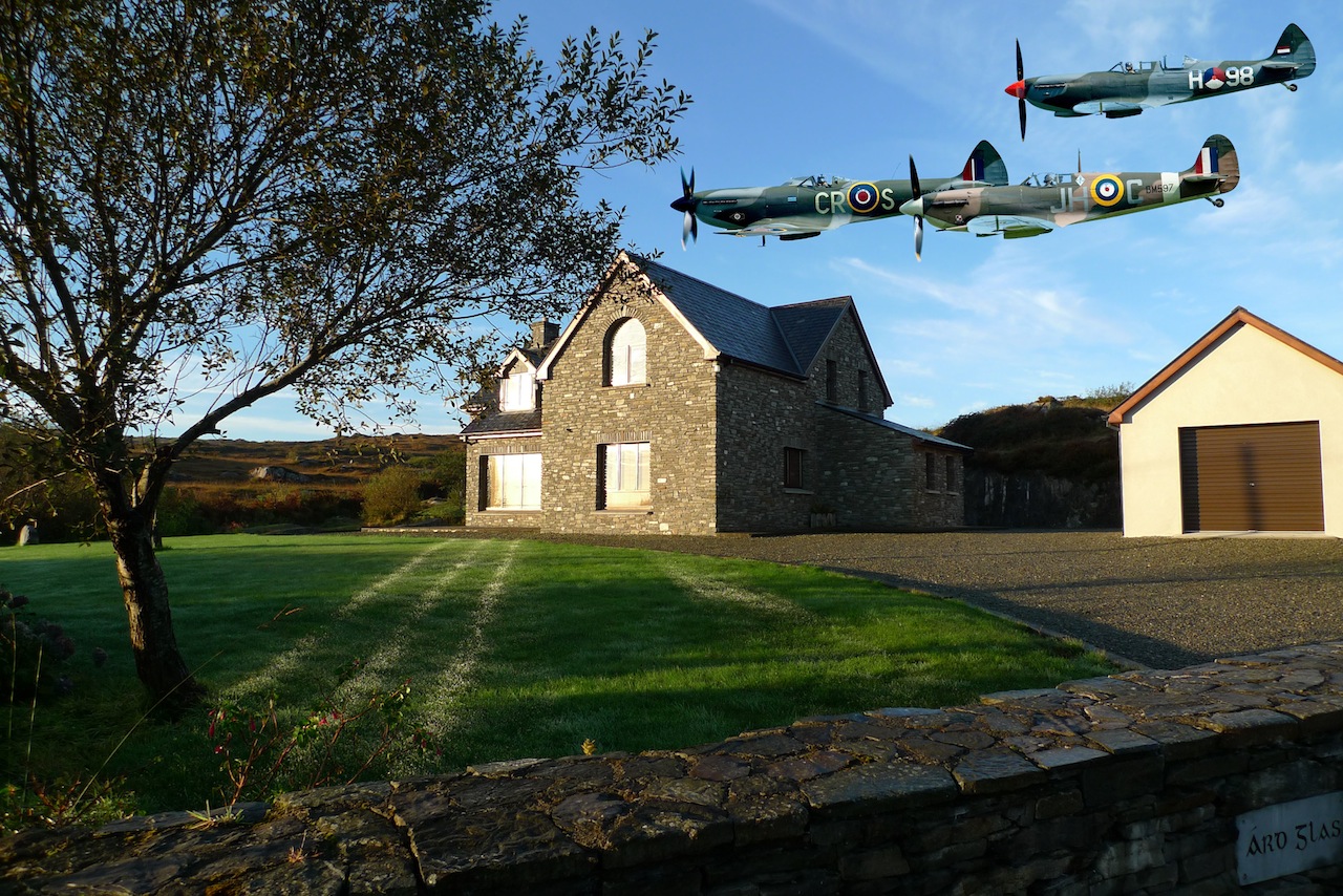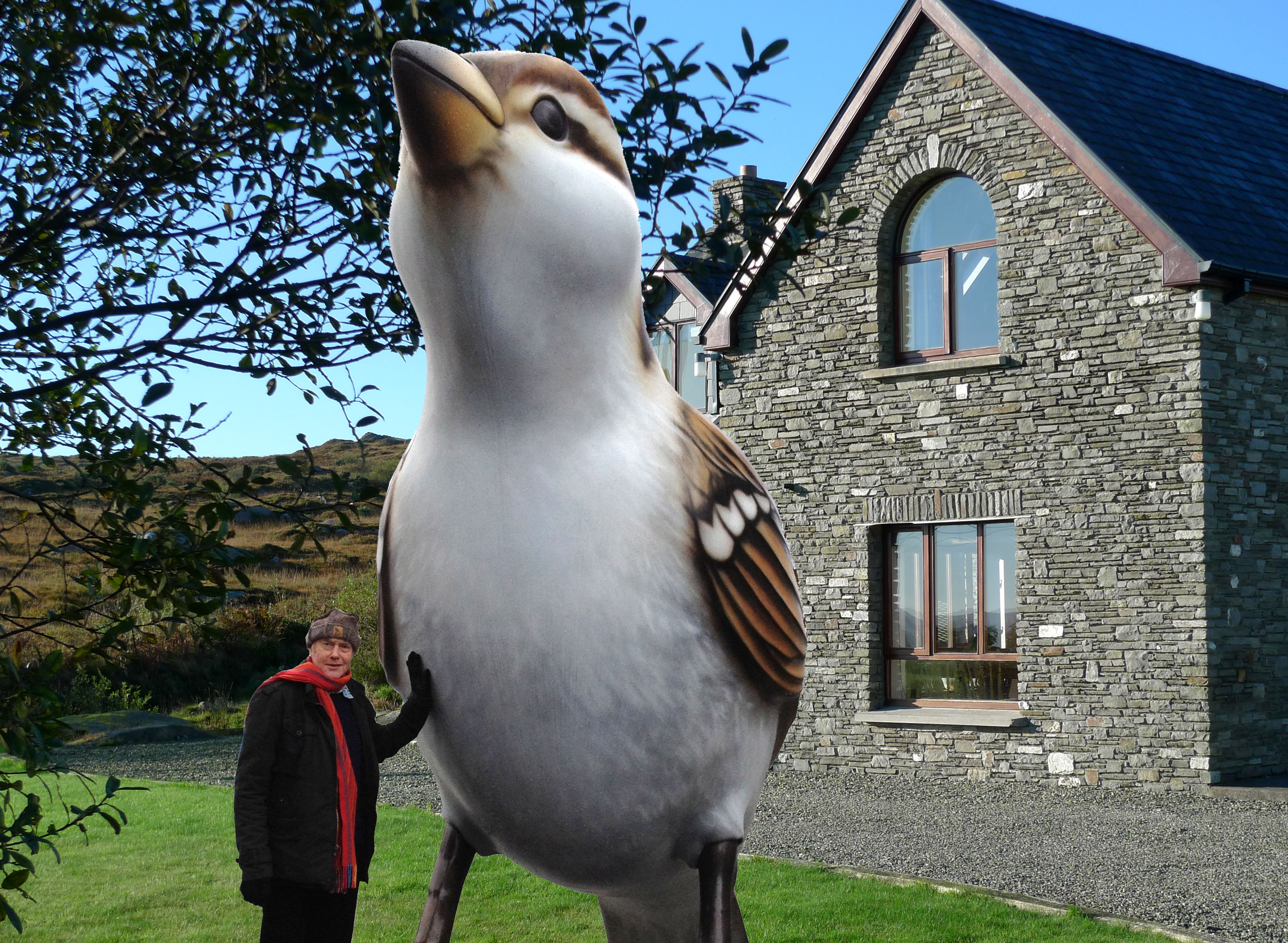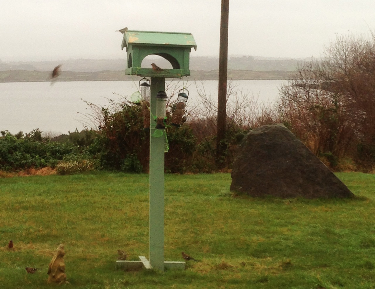 Perhaps you didn’t know that we have our own mini airport here – right outside Ard Glas! It all started when we asked our friend Danny – who constructs wonderful furniture and accoutrements in the Irish vernacular, and paints them green – to make us a birdtable. He duly did so, and painted it green. It now sits outside our windows and provides us with hours of entertainment.