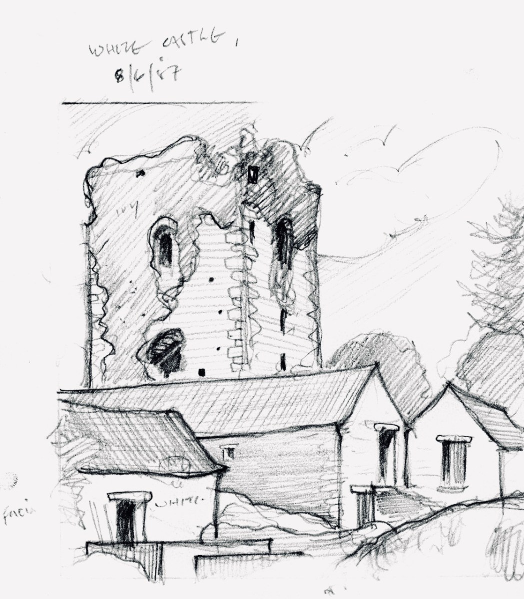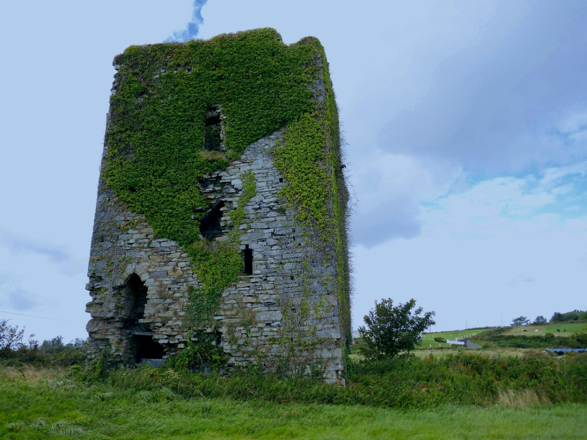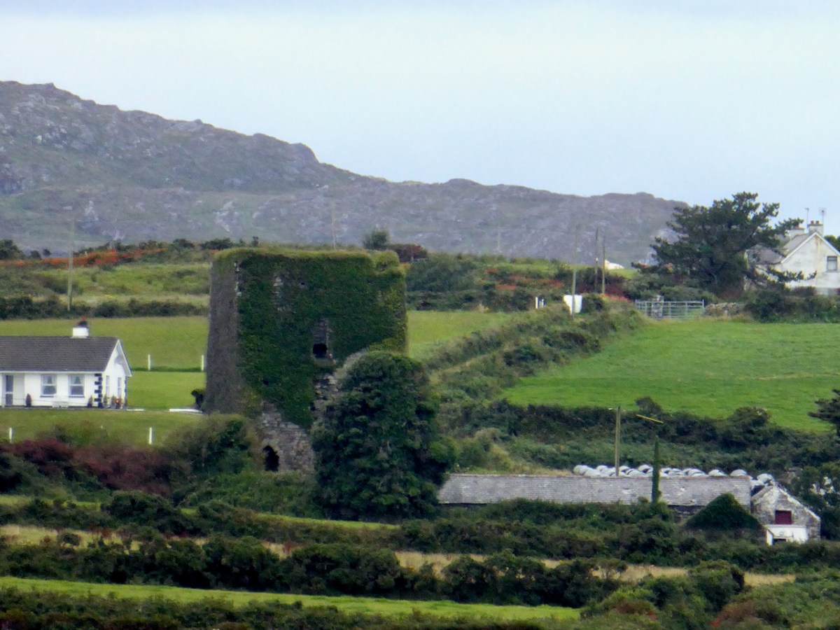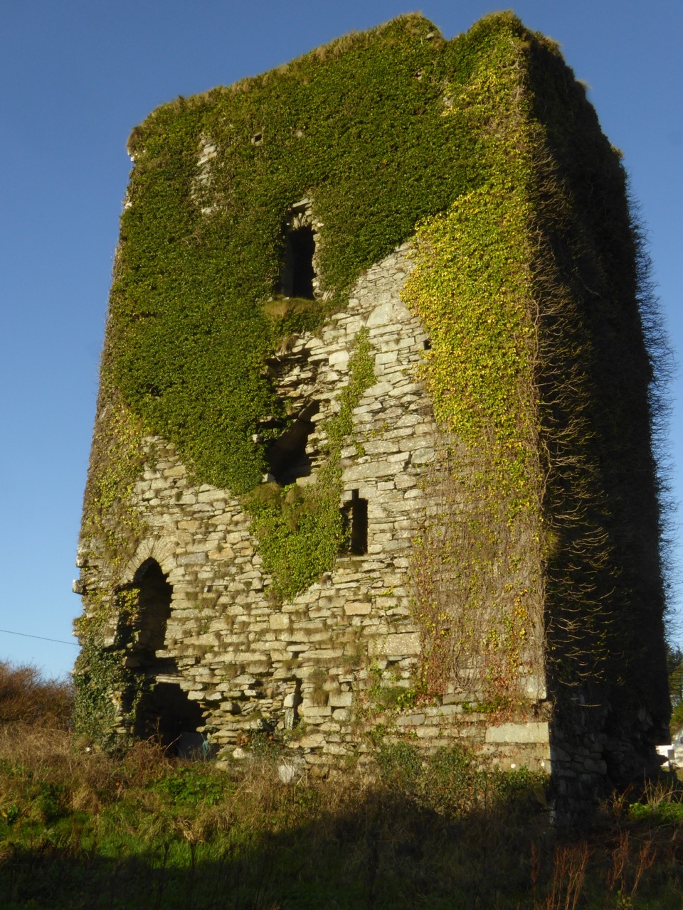 The flanking tower (above) is covered in ivy, so it’s hard to make out details. It may have looked a bit like the one Westropp called The Turret, at Dunlough.