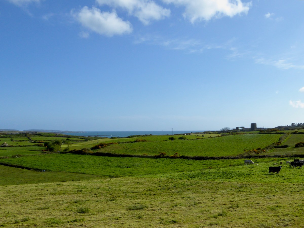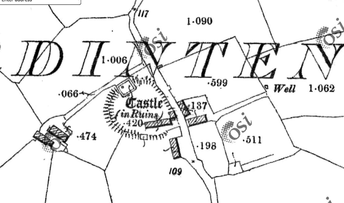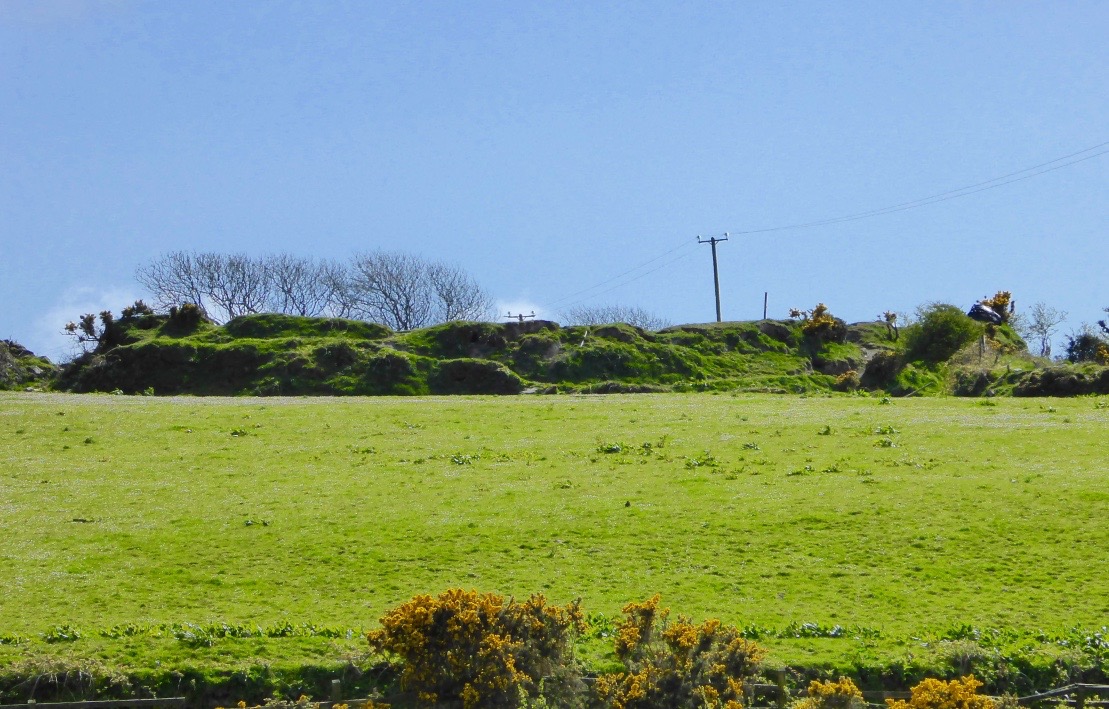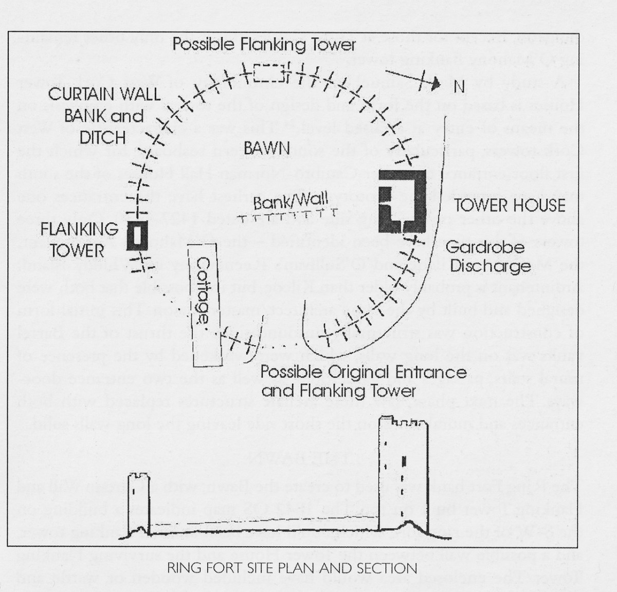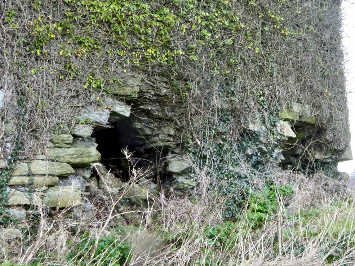 The presence of the ringfort raises an intriguing prospect since it appears that instead of the usual rectangular bawn, surrounded by a stone wall (see the illustration in this post), we have a round bawn, with the stone wall built on top of the bank of the ringfort. Although that stone wall is not obvious now, it is noted in the description of the ring fort in the National Monuments survey. Thus, what we have here is a hybrid ring fort/tower house – a sensible adaptation of a pre-existing fortification and a continuation of the site as a high-ranking residence. The National Monuments survey also refers to an external fosse, although traces of it are hard to see on the ground. If it was originally a substantial ditch, another possibility is that the bank was surrounded by a moat.