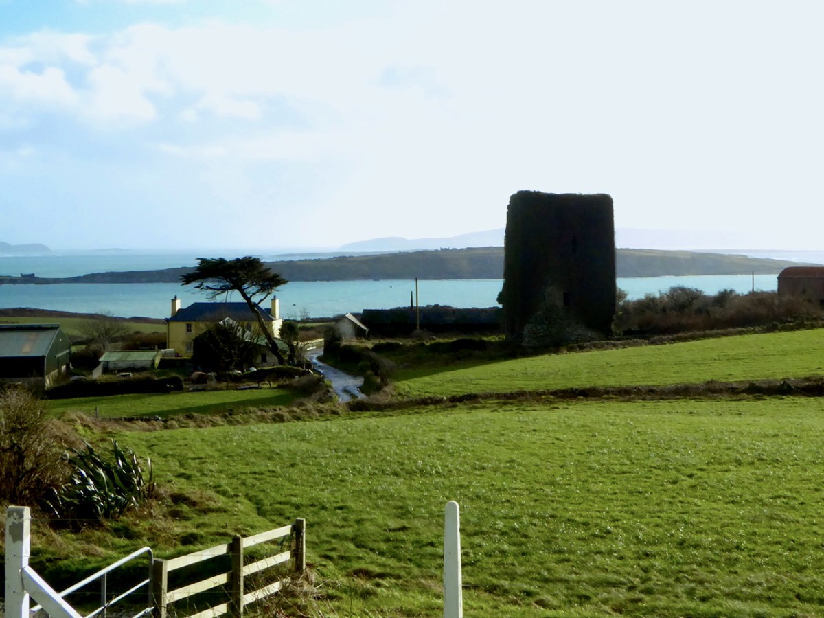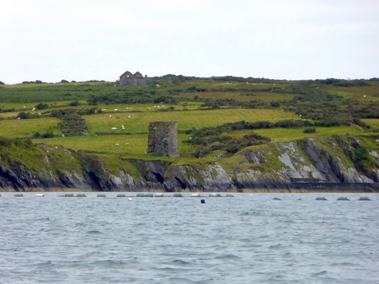 First the name – Ardintenant has been variously interpreted as coming from Árd an Tine (Ord on Tinneh, Height of the Fire), Árd an tSaighneáin (Ord on Tye-nawn Height of the Flash, or Beacon) or Árd an Tiarna (Ord on Teerna, Height of the High Chief). Any of these would be apt, since tower houses by the sea like this one (viewed from the sea, above) could be used as navigation beacons, possibly with a fire on the battlements. We also know that it was the residence of the head of the O’Mahony Clan, even though it was not the largest or most elaborate of the O’Mahony castles. Locally, it is also known as White Castle, which may refer to the white render that once made it stand out in the landscape (for more on render and castle colours, see the discussion on Kilcoe Castle). The photograph below demonstrates that it was prominent on the landscape and close to, although not right on, the sea.