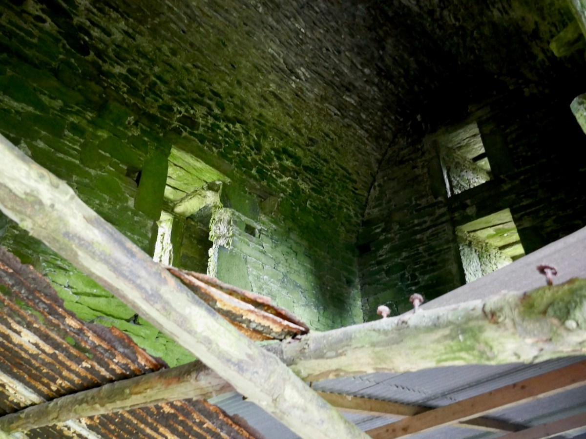 At Ardintenant, as with Dunmanus, the ground floor has been in use as a cow byre. It is normally impossible to access the upper floors, although those who have done so report that it is in good condition. That floor is reached by means of a mural staircase that rises from the raised entry.