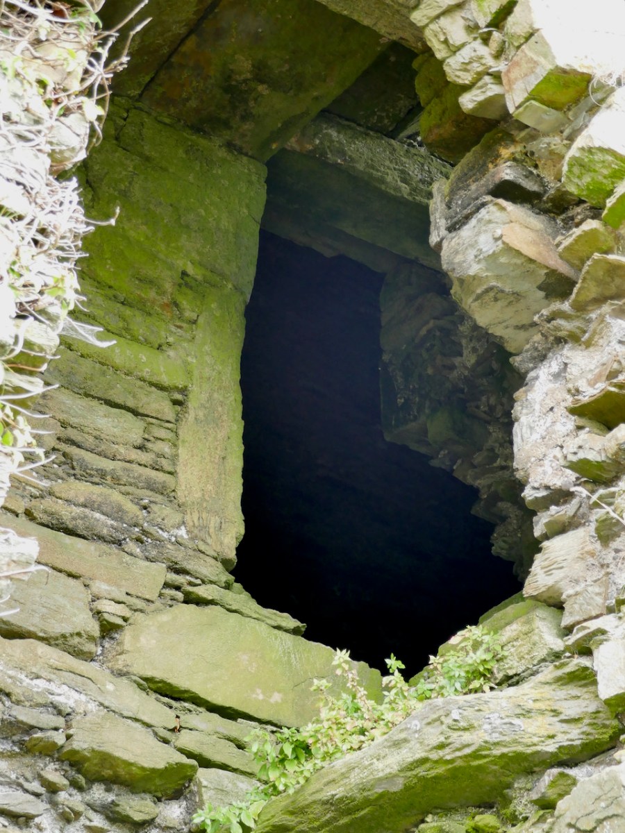 Hawkes tells us that “its function appears to have been to accommodate hostages.” He bases that on the absence of a ground level entry (the current hole on the ground level having been broken through in more recent times), so that the ‘dungeon’ was accessed through a trap door from the room above, which in turn he calls a ‘detention room.’ See my post on Dunmanus for a discussion of possible functions for rooms like the ‘dungeon.’