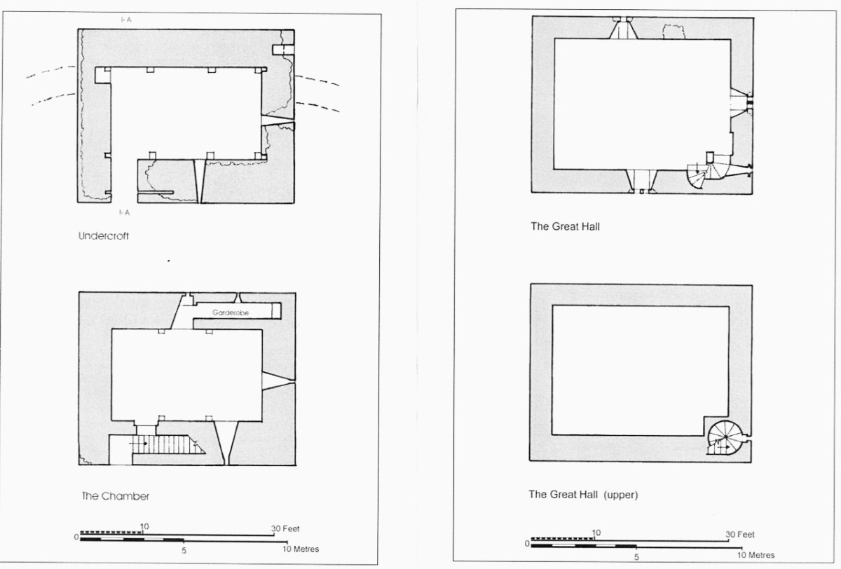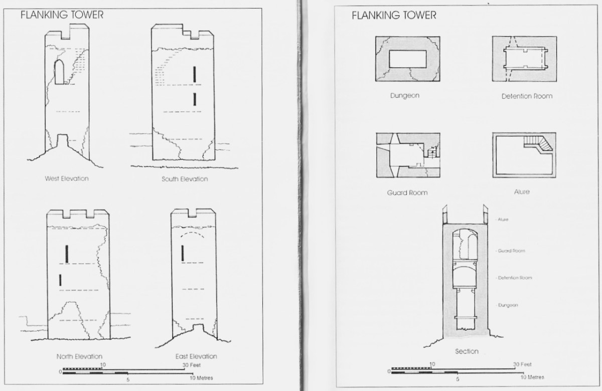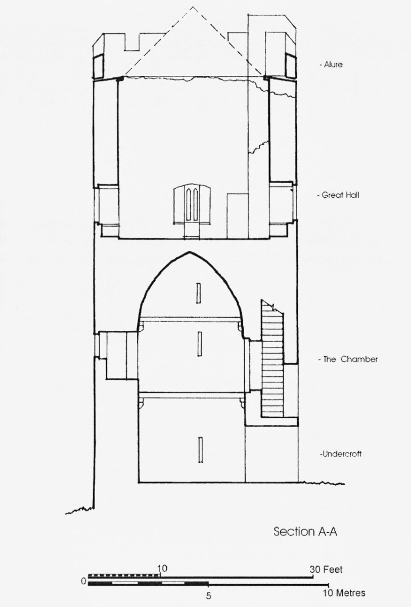 It’s much smaller than the castle, rectangular, and three stories high. The illustration above, by Jack Roberts, indicates the relative sizes. The way in was from the level of the curtain wall and each floor was connected by a ladder, except for the wall walk/allure, reached by a spiral stone stairs.