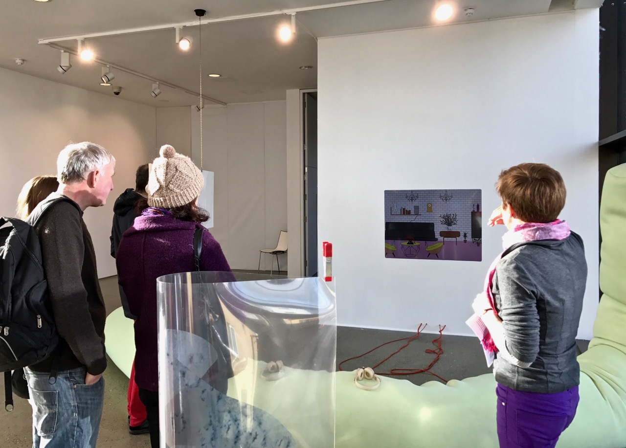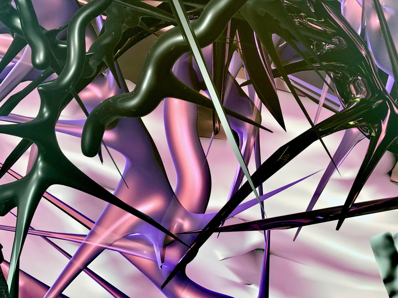 The second gallery held more surprises – and delights. Approaching through a narrow corridor I could see layers: more big, colourful panels on the far wall, more hanging, spinning sheets of opaque transparency, and a very contrasting soft, organic shape seeming to slither across the floor. As I came closer I realised that this shape was not slithering – or moving at all, disappointingly: it was a way of seating people in front of a screen, and was linked in to an array of very funky ‘designer’ headphones (white) by a jumble of thick, red chords.
