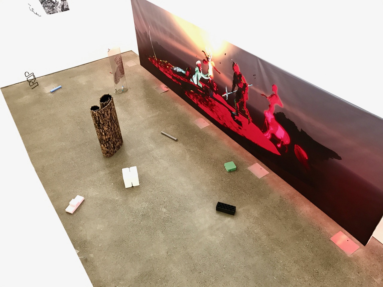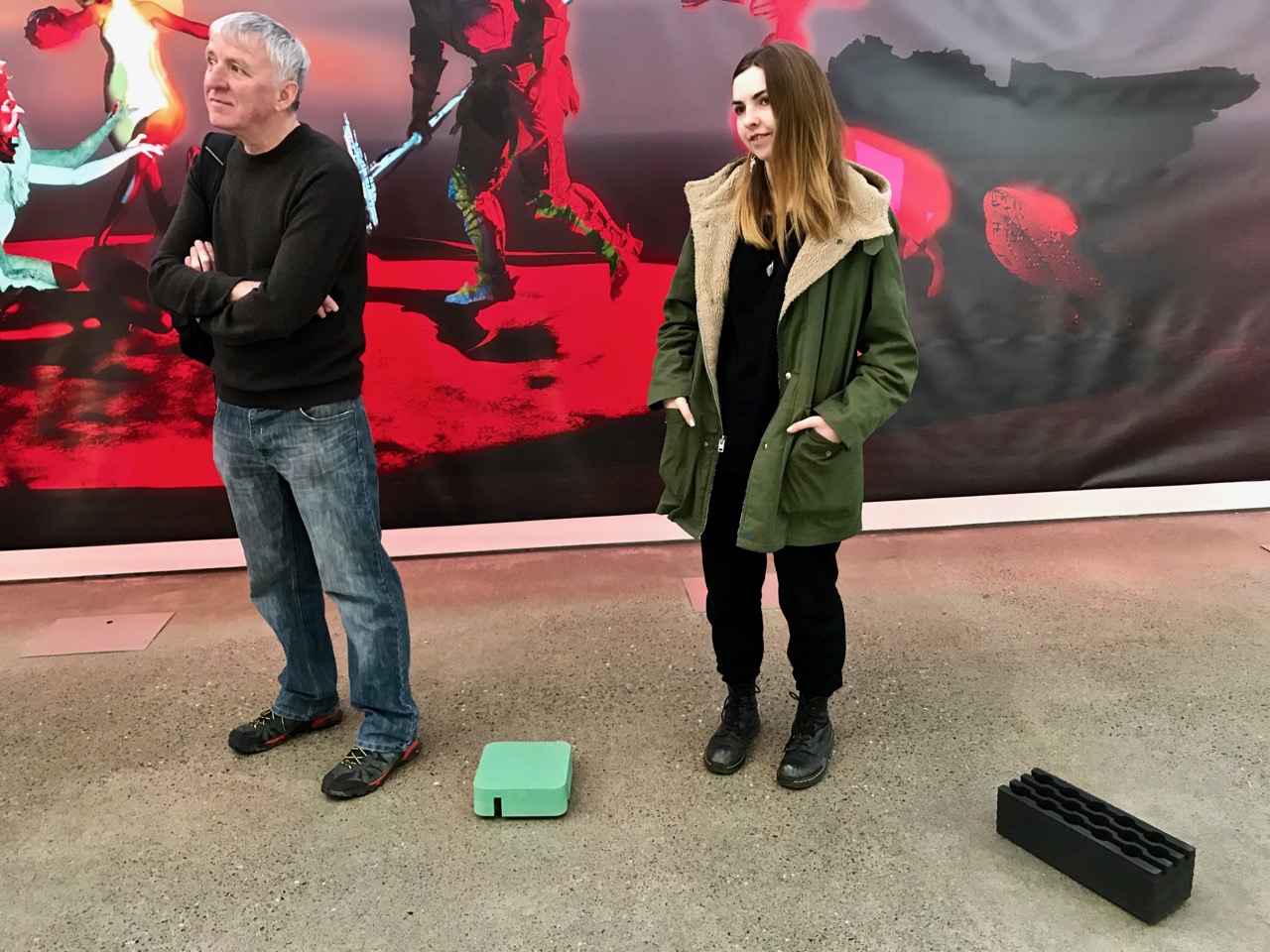 So – how did I react to my initial, completely unguided, tour of Scissors Cut Paper Wrap Stone? I’m pleased to say that I was stimulated – and positively so. I’m always attracted visually by large scale, colour, and things out of the ordinary: that gives you some clues! There are certainly unexpected experiences here. You walk into the first gallery and are hit with a huge print vibrating off the wall, its boundaries emphasised by coloured light behind it. It’s a riot of red – half-human and half- beast figures in a sort of Star Wars tableaux. But then, once you have taken that in you realise that the floor is alive – crawling with more strange beasts that look as though they have had another life as something mundane and practical and are now reincarnated to follow you around the gallery – perhaps to threaten you. What are they? Gallery assistant Kevin enlightened me when he came in to dismantle and repair the mechanics of one of these errant aliens: they are all made from packaging materials fitted with electric motors, and their trajectories across the gallery floor are completely random, referencing, perhaps, their previous lives travelling unsung and unrewarded all around the world. It’s funny how we give life to inanimate (but in this case animate) objects that appeal to us: perhaps it’s a jump back to childhood days when we made things from cereal packets and egg boxes but were then convinced that we had breathed existence into the monsters, dragons, spaceships, princesses (maybe) that we produced. Talking to the gallery staff I was fascinated to hear that some visitors were absolutely convinced that these pieces of mobile packing were imbued with very sophisticated artificial intelligence and really did follow them around and confront them! Remember, this was still before I had any knowledge of the intentions or stimuli behind the exhibits.