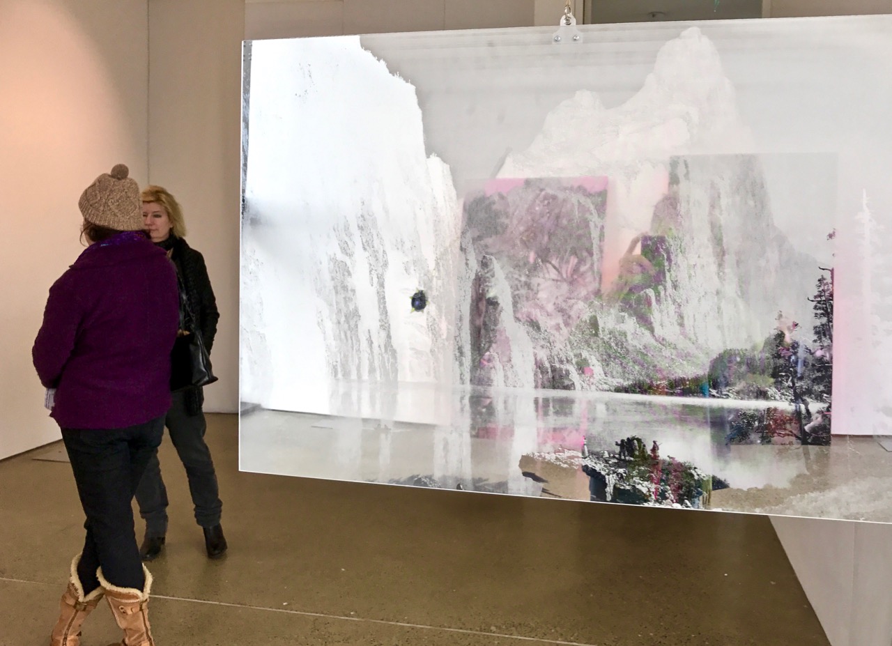 Moving upstairs to the second gallery I found the walkway obstructed by rotating panels of some material (was it glass?) that seemed to be engraved with semi transparent images: they looked like iconic landscape scenes. As I watched, I realised that at certain points in their spinning I was able to see through them, but at the same time also see reflections on their surfaces – of me, of the gallery, of the view through the windows… I liked these very much, and the dymanic nature of their movement and the unpredictable refractions and reflections. I was keen to know how their conception fitted into what I had seen previously downstairs, but I couldn’t guess.