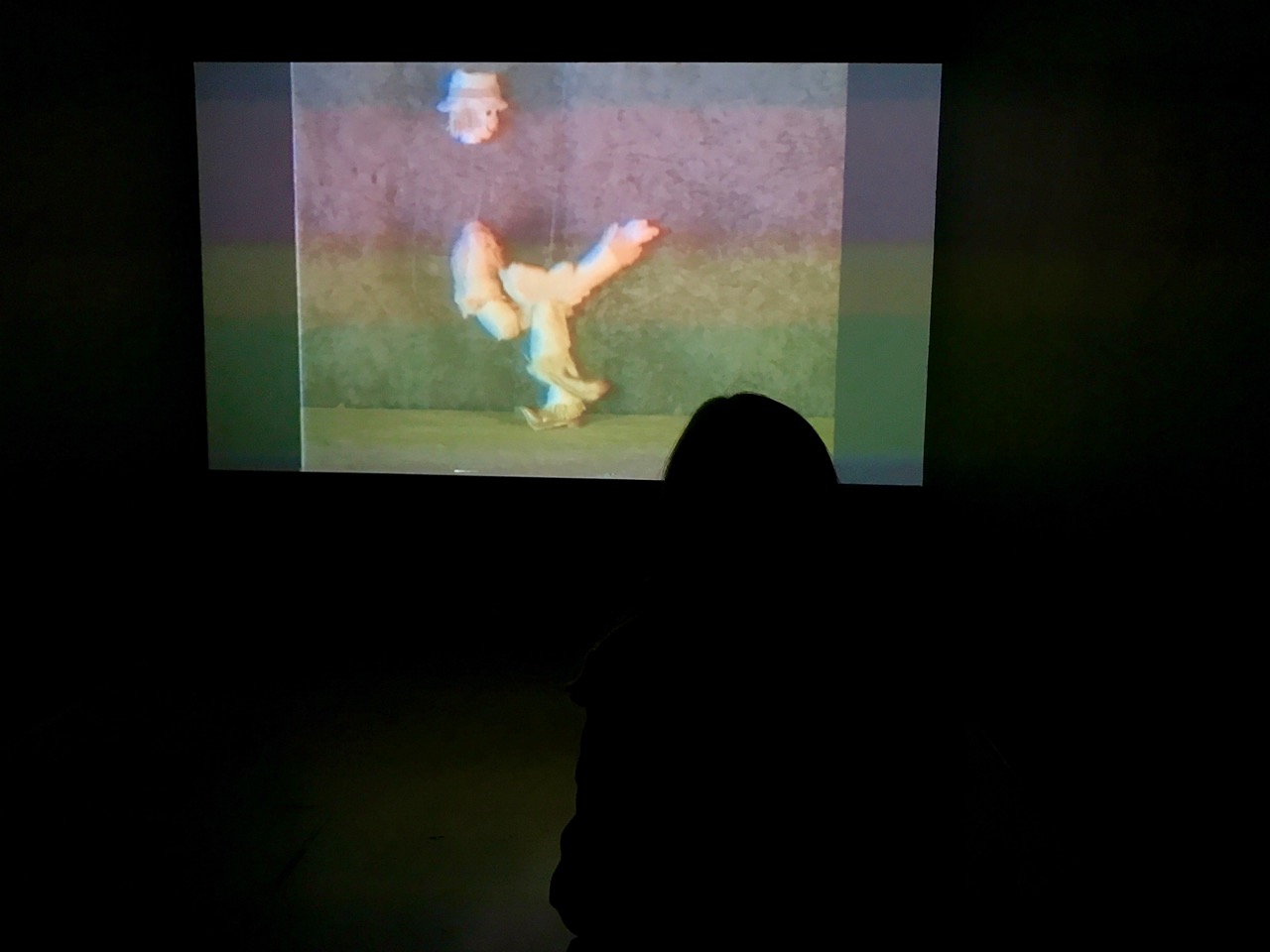 I sat and watched the ‘show’ – and listened to clunky music and a strange commentary – and then realised I was completely out of my depth! I had no clue what was going on. My attempt to experience the exhibition without any preparation or foreknowledge had failed. This applied to all the other work in the upper gallery also: superb large graphics on the walls and floors, printed acrylic sheets suspended on smart steel stands, and, in a darkened cubicle, a film of puppets which reminded me completely of ‘Bill and Ben the Flowerpot Men’! Now, how many of you remember them, dear readers? I don’t suppose any of the contributing artists are of my generation – so, is that pure coincidence? Anyway, I could not feel a sense of connection between the exhibits: but I liked the experiencing of them, nevertheless.