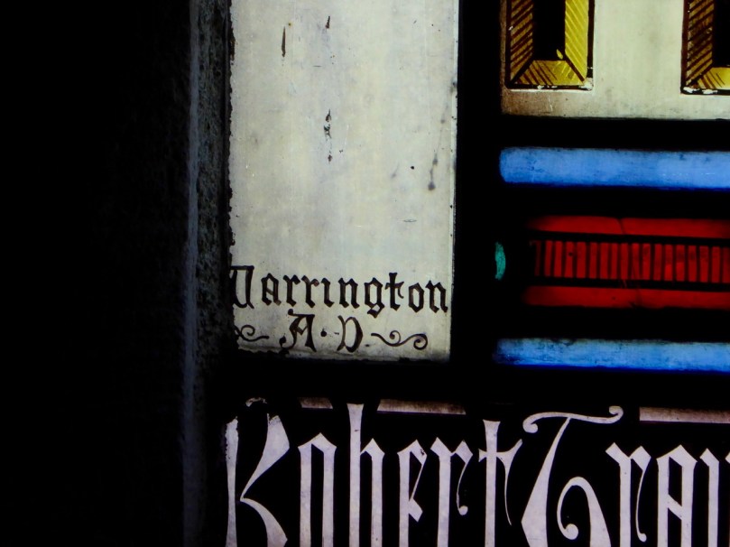 The signature of the Warrington Stained Glass Company on the East Window, dated to 1865