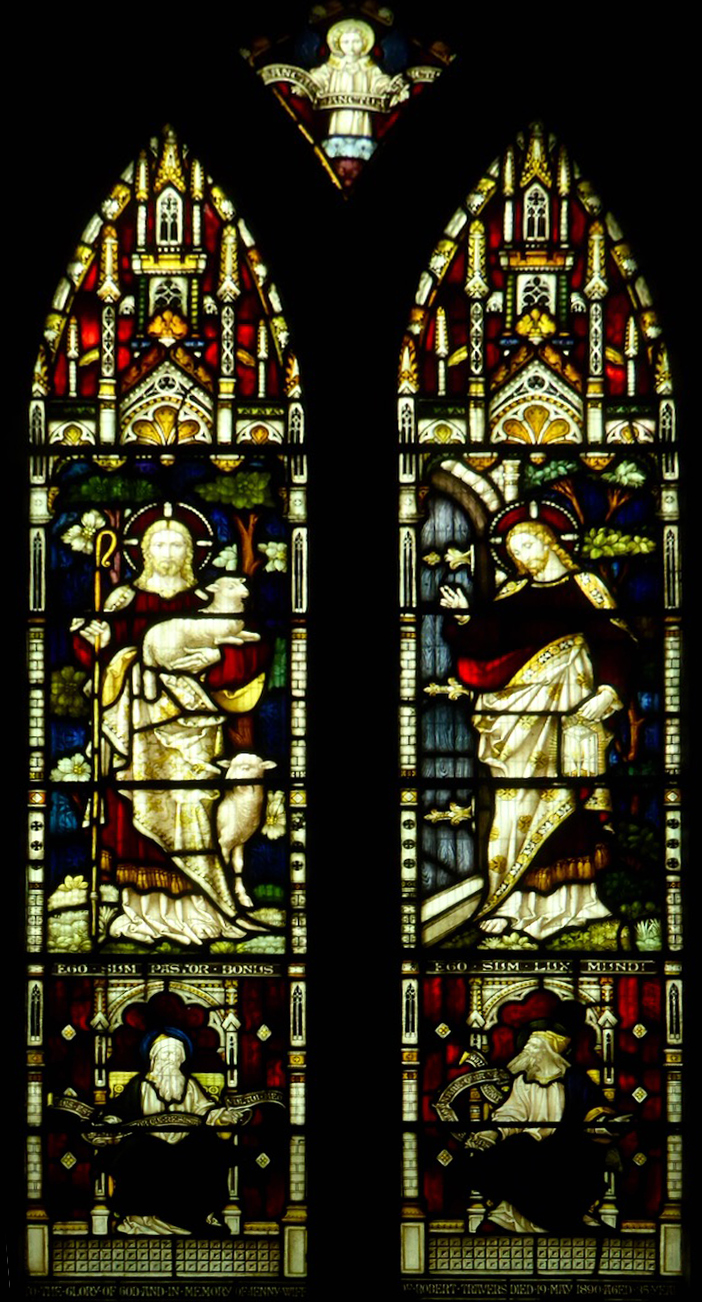 There are three more windows in the south transept, all by the firm of Clayton and Bell, a very productive Victorian stained glass studio. The first is a two light window, dating from 1890 and it depicts Christ as the Good Shepherd and the Light of the World (below). These two images were very much stock-in-trade with all the stained glass studios. The Light of the World was particularly popular – take a look at this post to see just how popular: The First Viral Sensation: How a Pre-Raphaelite Painting Inspired a Generation