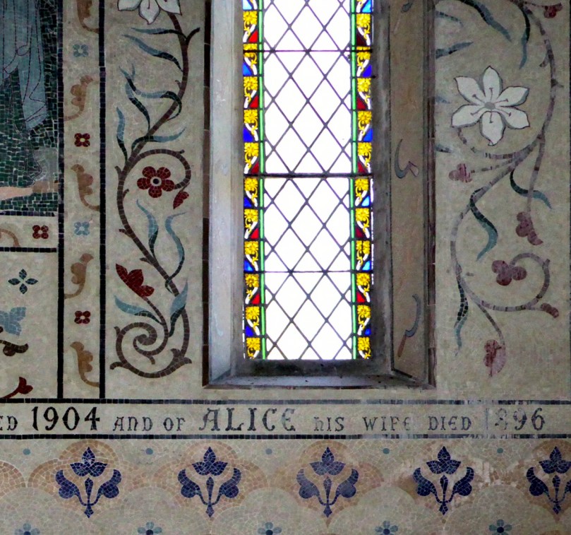 Pugin designed several churches in Ireland (mostly Catholic), especially in Wexford, where you can follow the ‘Pugin Trail’. (I don’t know who wrote the Wexford Pugin Trail brochure, but it is one of the best explanations of his style and influence that I have read.) While he did NOT design the Church of the Ascension, his influence is everywhere in evidence, along with the use of some of his favourite suppliers – Minton for the mosaics and encaustic tiles and Warrington for stained glass. Later windows by Lavers Westlake and Co, Mayer of Munich and London, and Clayton and Bell follow the traditional patterns for stained glass and add immeasurably to the beauty and interest of the interior.