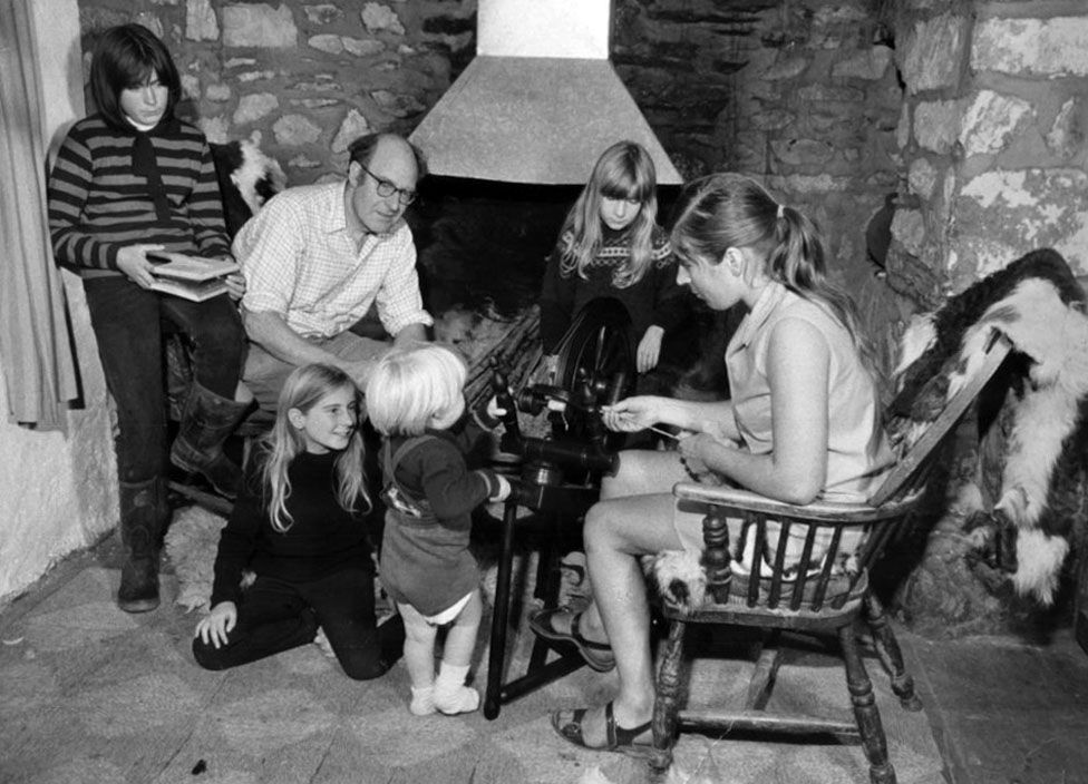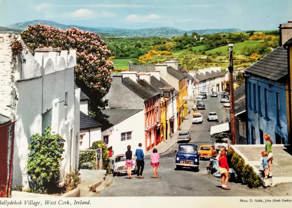 That’s John Seymour and his family in 1973, when the book was first published (upper picture) while the lower picture is a John Hinde postcard from around the same period showing Ballydehob. It looks a thriving, lively place with its coloured houses and shops, and I think those ‘Bohemians’ who are still with us today – and still have their homes in the village – would agree that it was in those days the centre of a very special world – of artists and craftspeople making a living and producing some exceptional work. Work that is being recognised, now, for its quality and unique character.